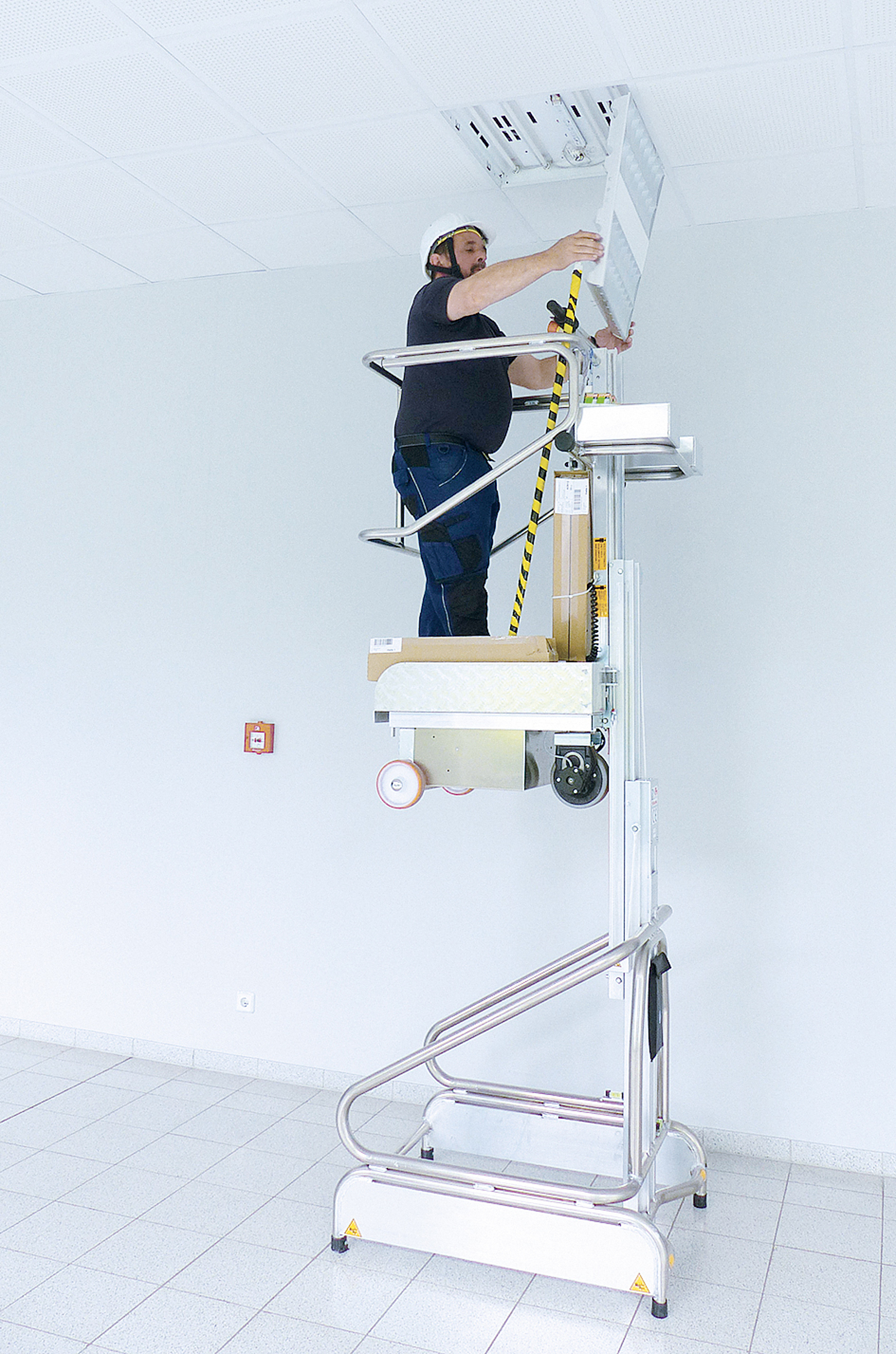 Sie können jetzt die gesamten Arbeitsmaterialien gleichzeitig transportieren, haben einen sicheren Aufstieg zu den Deckenbereichen sowie eine größere Arbeitsplattform ohne Absturzgefahr. Wegen einer Breite von nur 75 cm können sie mit der Hubarbeitsbühne durch jede Tür fahren und mittels Aufzügen die Etagen problemlos wechseln. Angesichts der Arbeitshöhe von 4 m können 95 % aller Decken und Leuchten erreicht werden. Durch den Einsatz der Arbeitsbühne konnte der Gesamtaufwand beim Arbeiten in der Höhe von zwei bis drei Tagen auf zwei bis drei Stunden in der Woche reduziert werden. Auch der Arbeitsschutz konnte erheblich gesteigert werden, wodurch es zu weniger Absturzunfällen kommt.