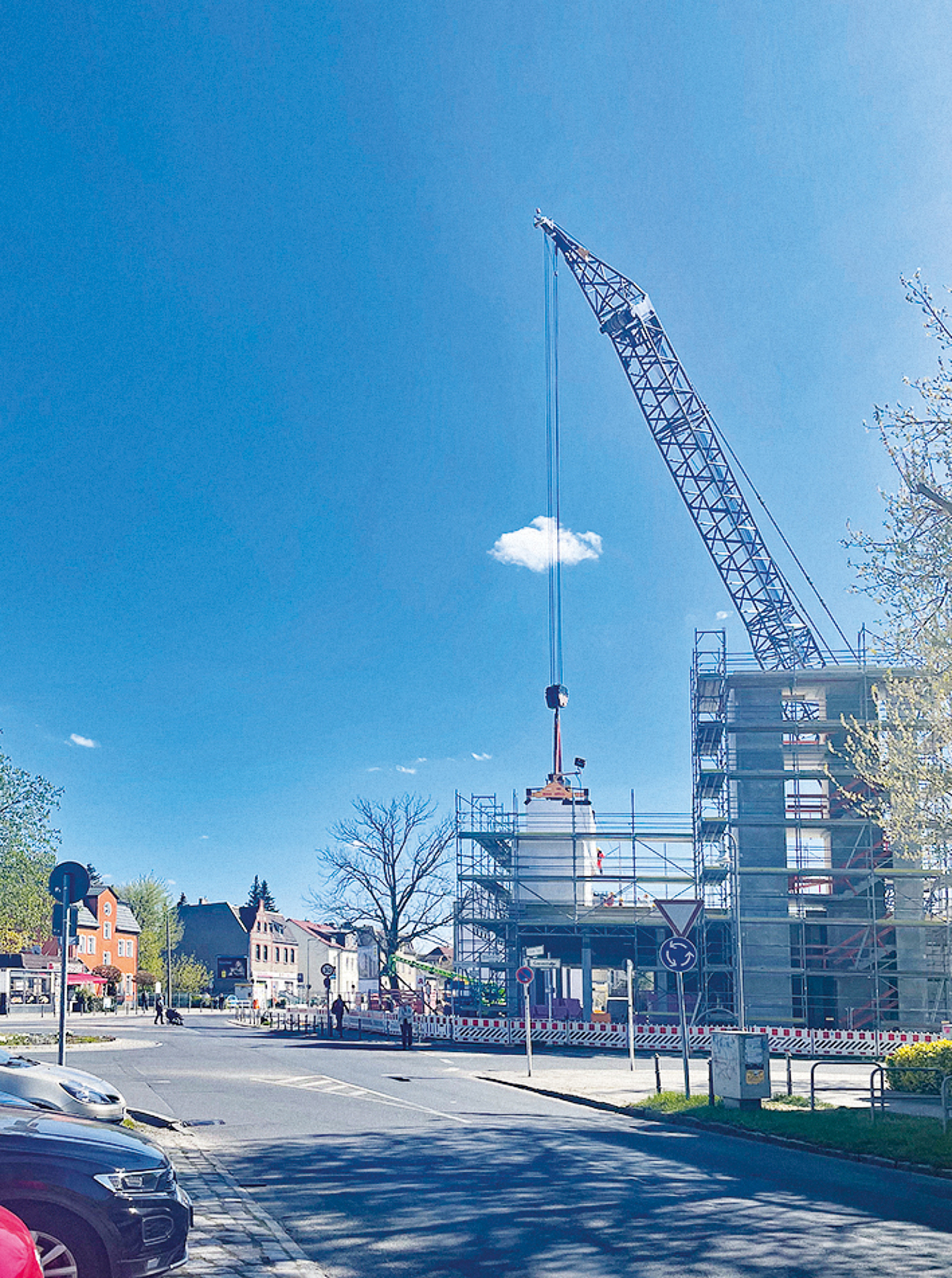 Auch die Sauberkeit fällt hier auf. Nur wenige Materialien müssen gelagert werden. Noch einen weiteren Vorzug führt die Bauleiterin an: „Trotz ihrer Ausmaße lassen sich die Raummodule auch auf engstem Raum wie hier per Kran vertikal wie horizontal sehr gut händeln. Für unsere Bauteams bringt das eine enorme Arbeitserleichterung.“
