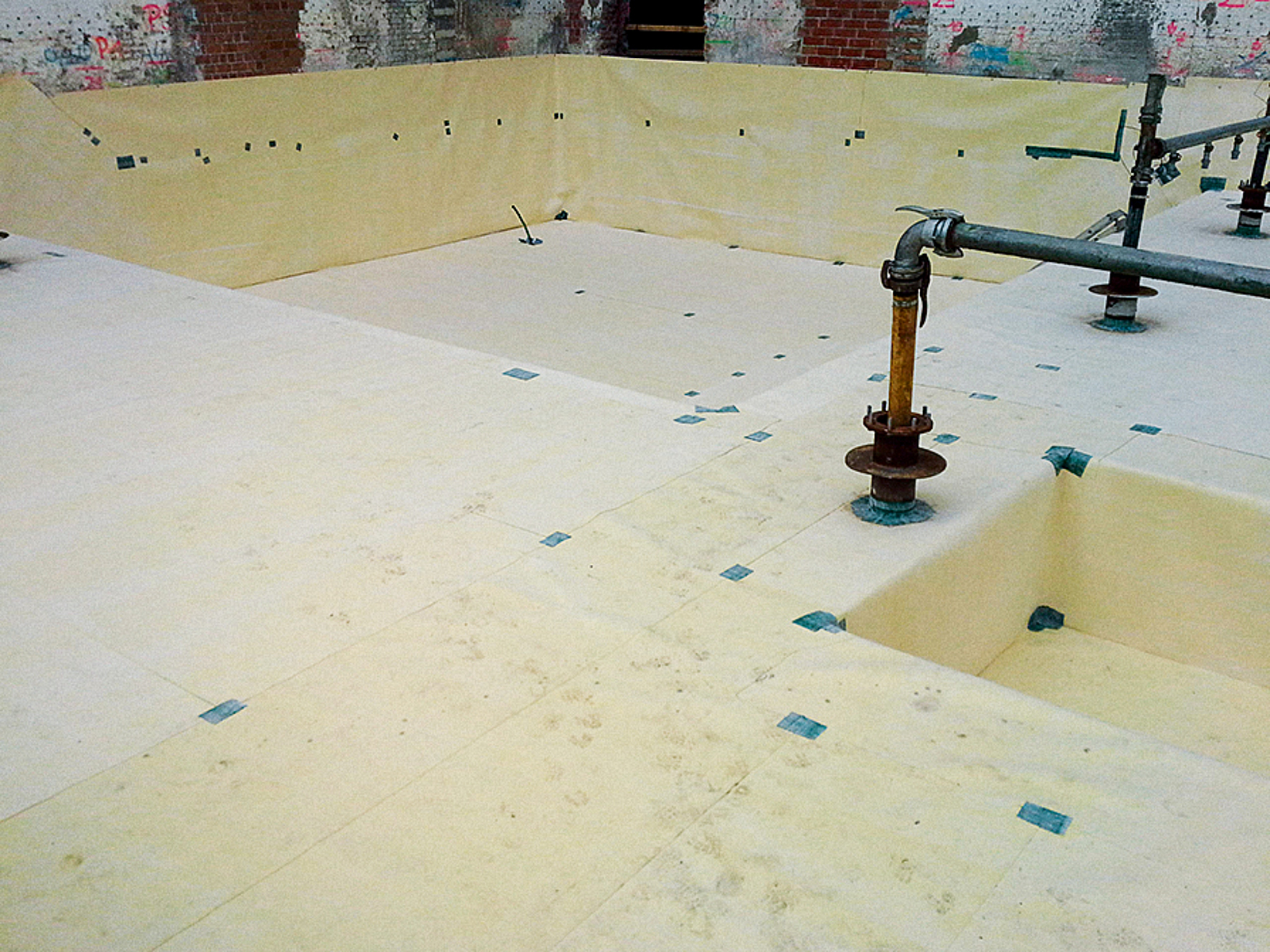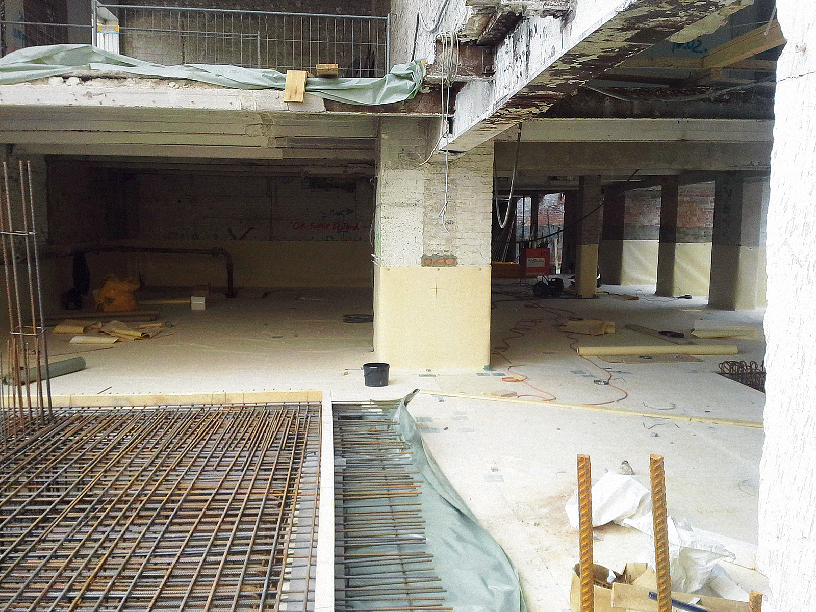 Im Deutschlandhaus in Berlin wurden die Frischbetonverbundbahnen auf den 2.500 Quadratmetern Bestandsflächen im Boden- und Wandbereich bis oberhalb des Bemessungswasserstands verlegt. Eine nachträgliche Horizontalsperre sichert die Bestandswände gegen aufsteigende Feuchtigkeit ab. Durchdringungen wie Rohrdurchführungen wurden direkt in das Frischbetonverbundsystem eingebunden. Für Nähte, Übergänge und Detailausbildungen können entsprechendes Zubehör oder geprüfte Kombinationssysteme genutzt werden. Nach der Verlegung der Bahnen erfolgten die Bewehrungsarbeiten. Anschließend wurde direkt gegen das Verbundsystem betoniert. In Kombination mit der daraus resultierenden dauerhaften Verbundwirkung mit Rissüberbrückung und Hinterlaufschutz stellt die gewählte Konstruktion eine höchstmögliche Nutzungssicherheit für die neuen Räumlichkeiten im Kellergeschoss des Deutschlandhauses her.