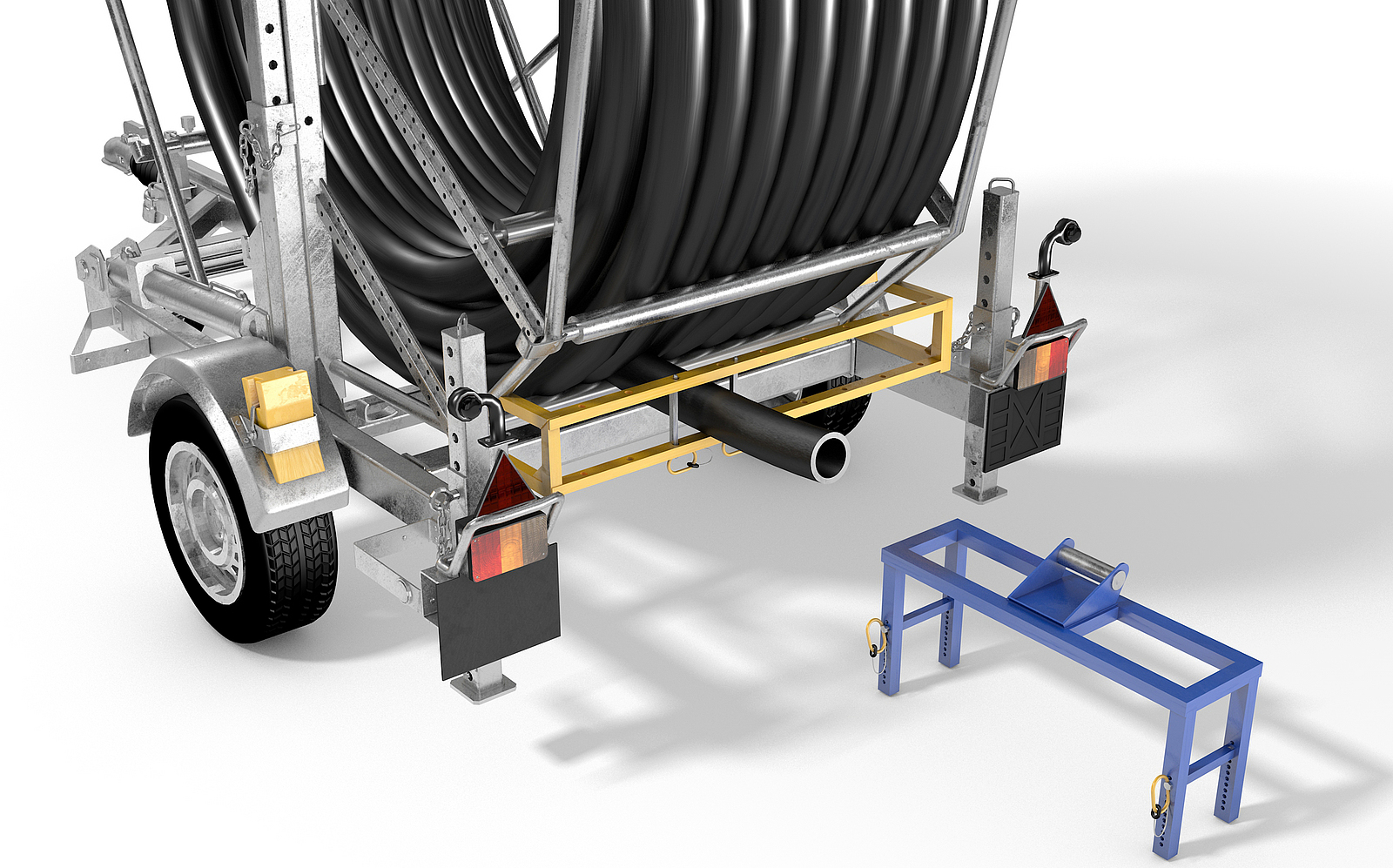 Mit dem Rohrabspulwagen können aufgehaspelte PE-HD-Rohre auf der Baustelle transportiert und gezielt abgerollt werden. Dies bietet eine erhöhte Sicherheit gegen unkontrollierte Bewegung en beim Abhaspeln vom Rohrbundanhänger.