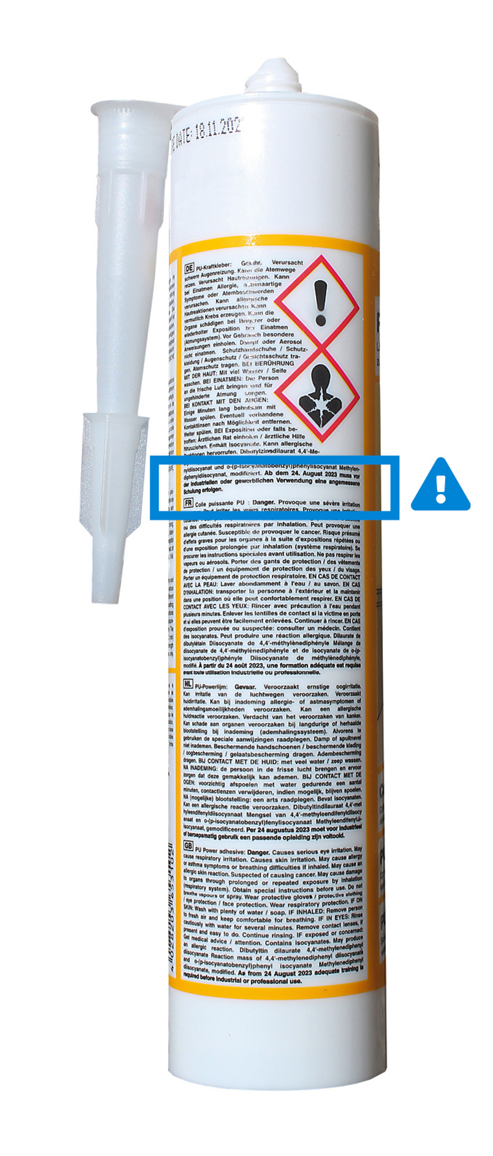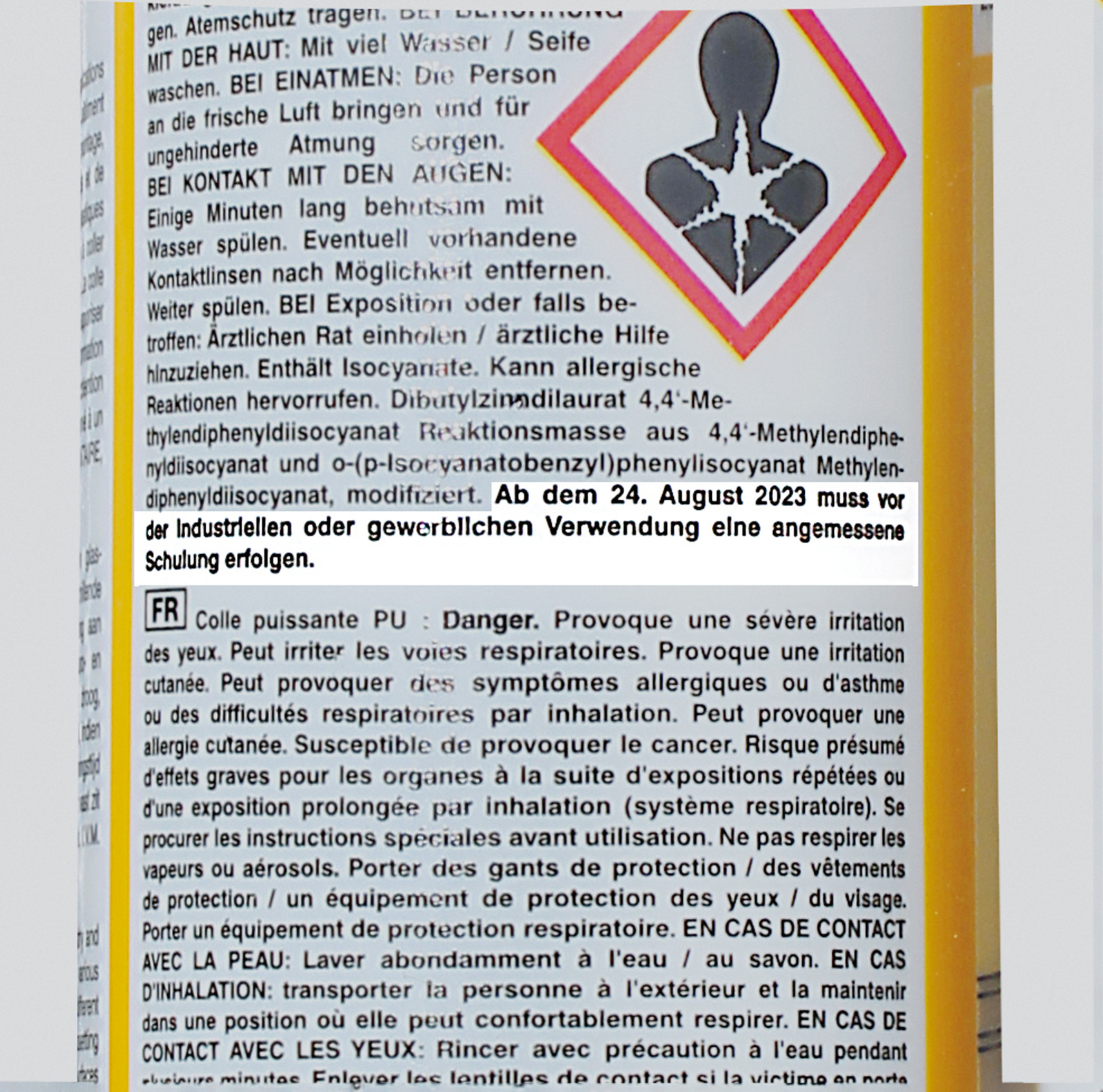 Die Beschränkung im Rahmen der REACH-Verordnung besagt, dass Verwenderinnen und Verwender Produkte, die Diisocyanate enthalten, nach dem 24. August 2023 nur dann verarbeiten dürfen, wenn sie die erfolgreiche Teilnahme an Schulungsmaßnahmen belegen können. Die Teilnahme muss der Arbeitgeber sicherstellen. Der Hinweis auf die notwendigen Schulungen muss zudem ab Februar 2022 auf den Produkten angebracht werden.