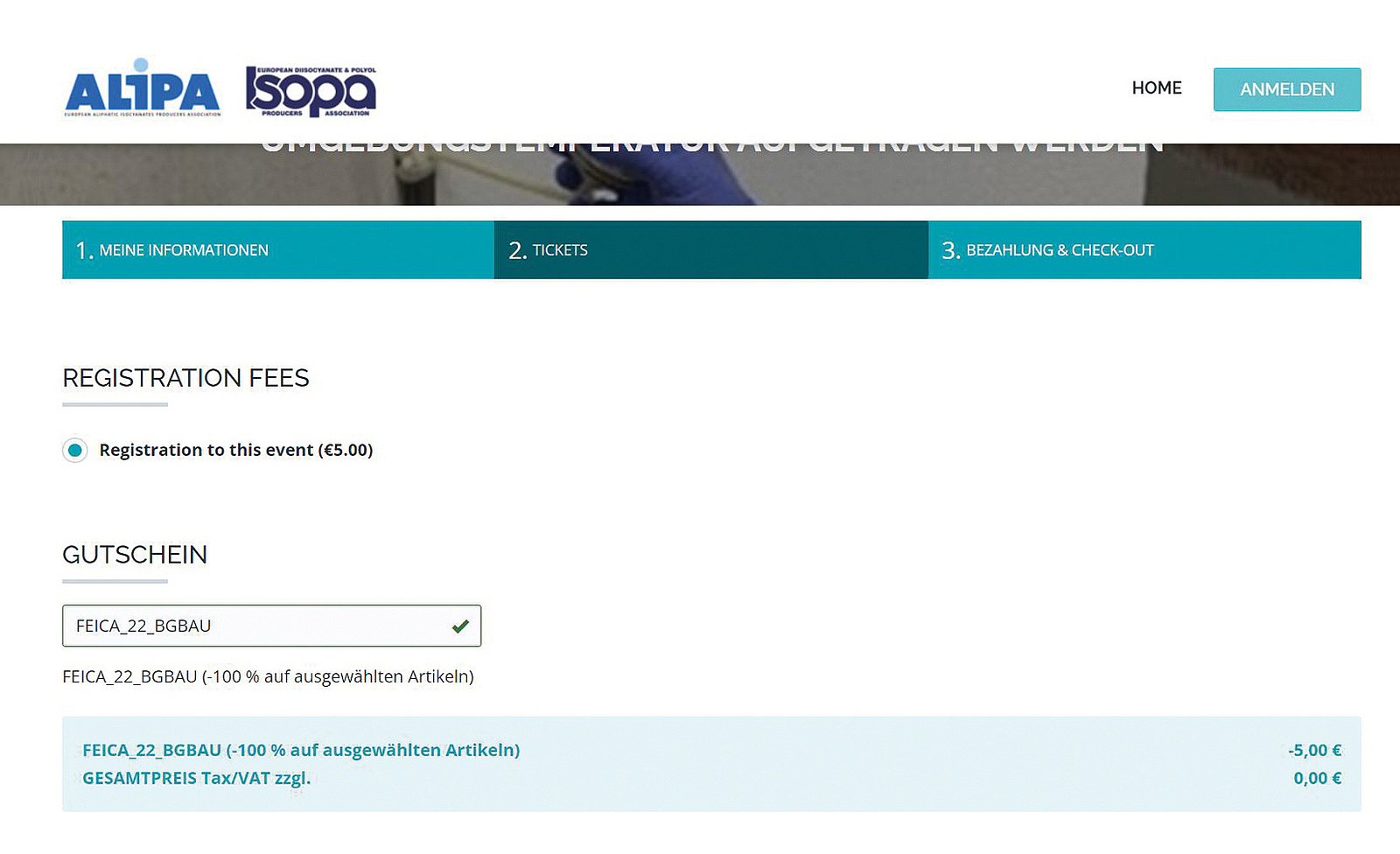 Nach Eingabe der Anmeldedaten unter „1. Meine Informationen“ kommt man zur folgenden Seite „2. Tickets“. Hier muss unter „Gutschein“ der Freischaltcode FEICA_22_BGBAU, der für die Kurse 048, 049 und 050 gilt, eingetragen werden.