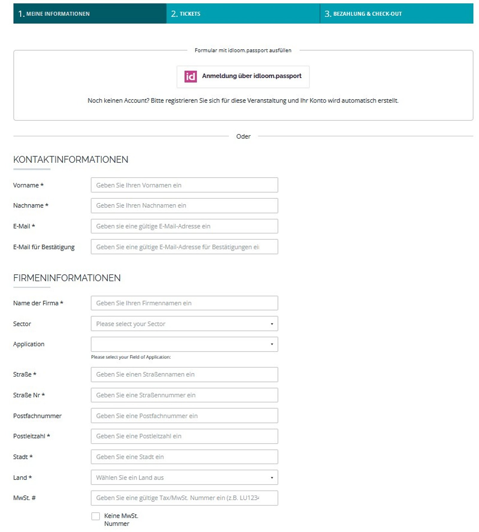 Zunächst sind unter 1. Meine Informationen" die Angaben zu Kontakt-, Firmen-, und Rechnungsinformationen einzugeben.
