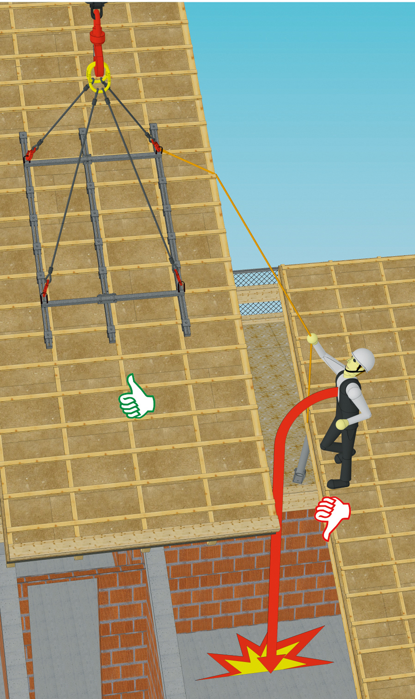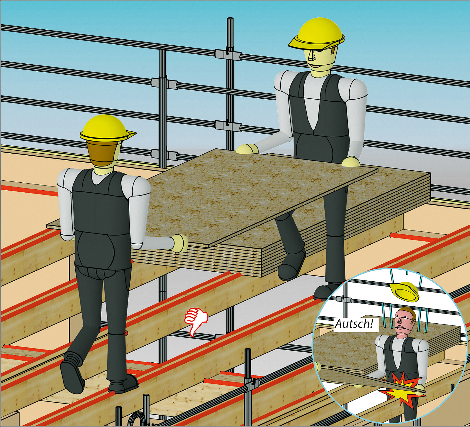 Nach wie vor gibt es ein hohes Absturzrisiko beim Richten von Dachstühlen aus Einzelbauteilen. Jede obere Balkenkante stellt eine Absturzkante dar (Abb. 1)! Je länger man sich an Absturzkanten aufhält, desto größer ist das Risiko, irgendwann abzurutschen und abzustürzen. Eine sehr schmerzhafte Sturzvariante zeigt das kleine Bild. Viel zu oft wird die Ausführung der Beplankung den Auftraggebenden als Eigenleistung angeboten. Die Folge ist eine unnötig große Absturzhöhe im weiteren Verlauf des Richtens bei Arbeiten an oder sogar auf der Firstpfette.