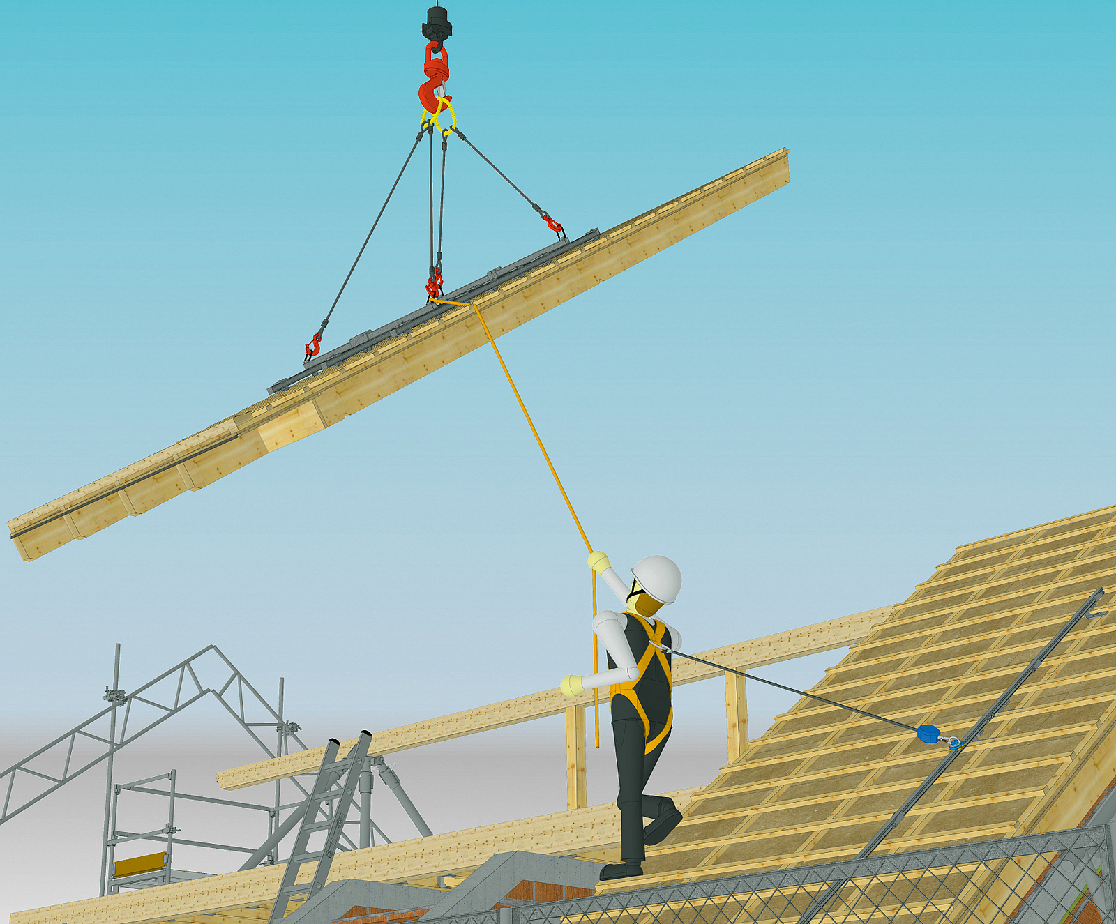 Auf der DACH+HOLZ 2022 in Köln konnte ein Seitenschutzsystem vorgestellt werden, das eigentlich zur Sicherung auf Flachdächern vorgesehen ist und mit Betonplatten beschwert wird. Zur Sicherung auf Decken- oder Dachelementen wurde es so modifiziert, dass es bereits auf dem Lkw auf das nächste zu montierende Element geschraubt werden kann. Dadurch ist der Seitenschutz sofort nach der Verlegung und Fixierung am Bauwerk wirksam (Abb. 5). Wenn bei der Verlegung noch das auf der anderen Dachseite gegenüberliegende Element fehlt, stellt auch der Firstrand eine Absturzkante dar. Bei der anschließenden Verlegung des gegenüberliegenden Elements kann der Seitenschutz am First entfallen. Mit zwei oder drei Seitenschutzsets kann eine beliebig große Decken- oder Dachfläche sicher verlegt werden. Sobald das Folgeelement verlegt und fixiert ist, wird der dann überflüssige Seitenschutz am ersten Element gelöst und zum Lkw auf das nächste Element gehoben. Natürlich verlangsamt sich der Takt der Verlegung etwas durch das Handling des Seitenschutzes. In der etwas längeren Wartezeit können aber Verschraubungen und Stoß-Abklebungen ausgeführt werden, die sonst erst nach Verlegung aller Elemente erledigt werden könnten. Damit ist der zeitliche Mehraufwand bei genauerer Betrachtung nicht mehr so groß.