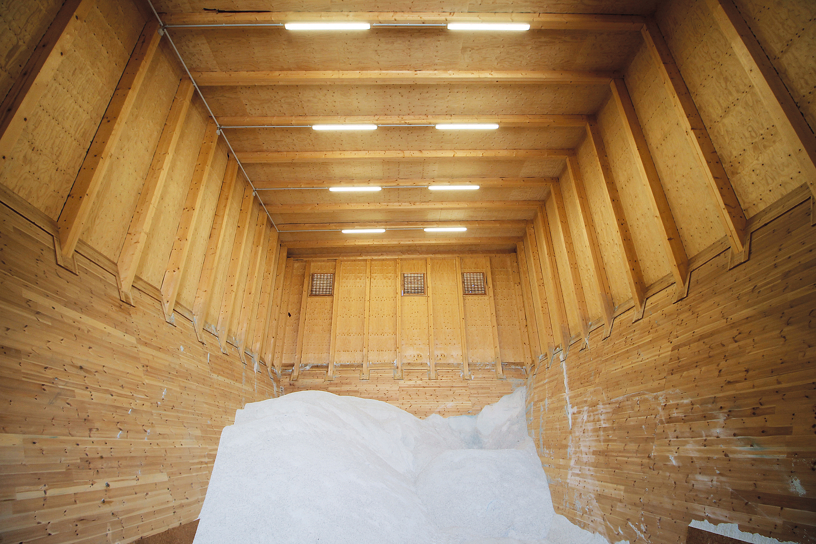 Das Tragwerk der Halle mit innerer Hülle, Wänden und Dach besteht aus vorelementierten Rippenelementen von 2,5 m Länge. Diese sogenannten Furnierschichtplatten mit drei werkseitig aufgeleimten Stegen wurden sowohl für die Wände als auch für das Flachdach der Halle gefertigt. Für das Salz selbst wurde ein trogartiger Baukörper mit 25 Grad geneigten Innenwänden aus Kiefer-Brettsperrholzplatten in das Innere der Salzlagerhalle eingebaut.