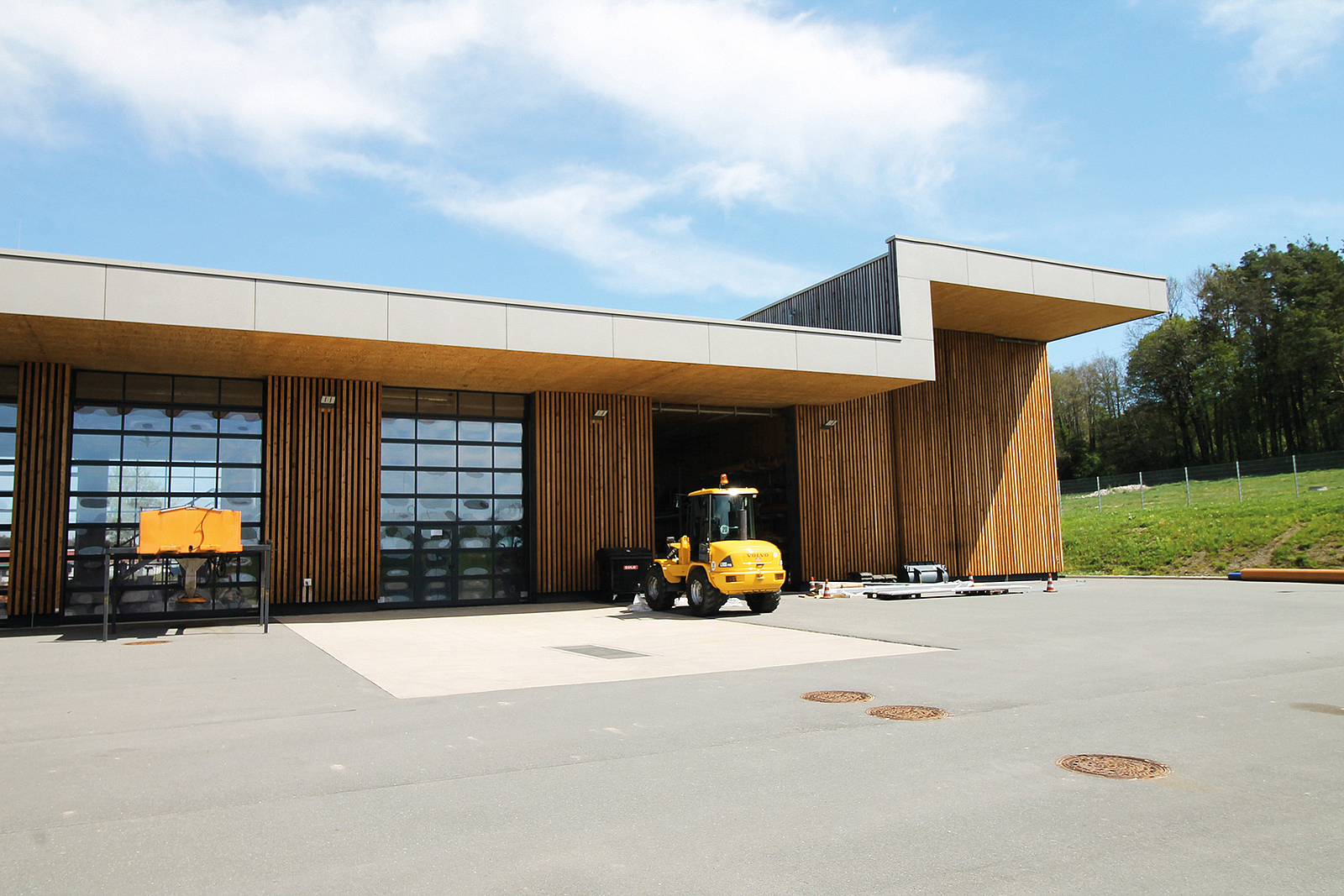 Die große Fahrzeughalle wurde mit Sektionaltoren ausgestattet. Diese doppelwandigen Tore sind im Hinblick auf die Wärmedämmung keine Schwachstelle mehr – im Gegenteil: Sie bieten erhebliche Vorteile durch ihre Robustheit, den Einbruchschutz und die guten Dämmwerte. Hinzu kommt die natürliche Belichtung. Zusätzlich hat man mit einer Zisterne die Regenwassernutzung für die Waschhalle, die Reinigung der Fahrzeuge und Geräte gesichert.