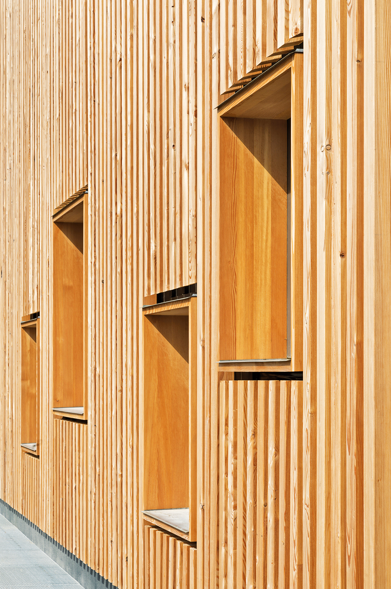 Fassadenverkleidung aus Lärche und Massivholzelemente aus Fichte