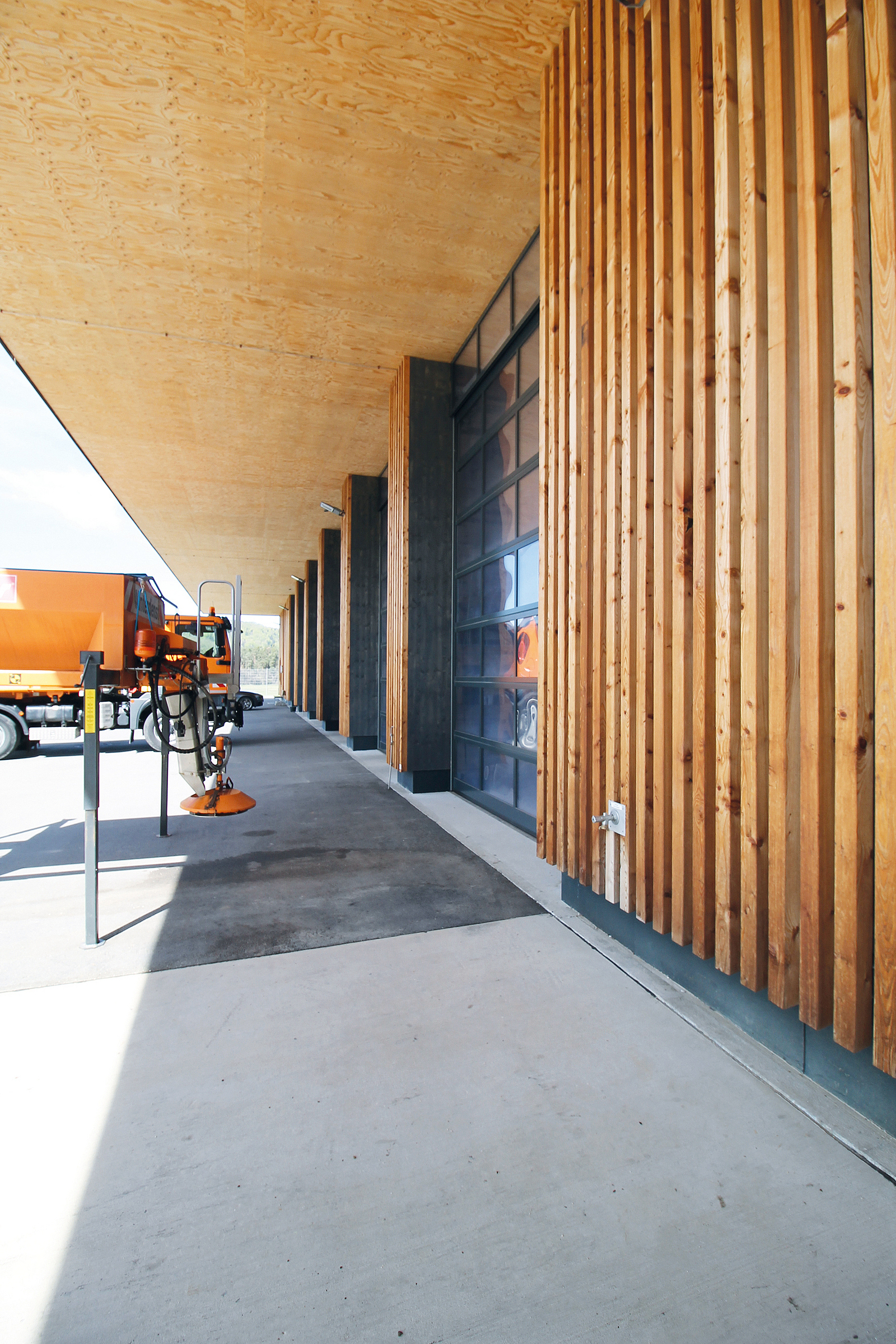 Die bei diesem Projekt mögliche Vorfertigung der Holzkonstruktion erlaubte eine rasche und witterungsunabhängige Montage. Bei der in weiten Teilen sichtbaren Rohbaukonstruktion aus Betonwänden und Decken aus Brettsperrholz wurde auch im Inneren ein Schwerpunkt auf Ästhetik gelegt. Die großflächigen Verglasungen der Fahrzeughalle tragen durch viel Lichteinfall ebenfalls zum Wohlbefinden der Bauhof-Beschäftigten bei.