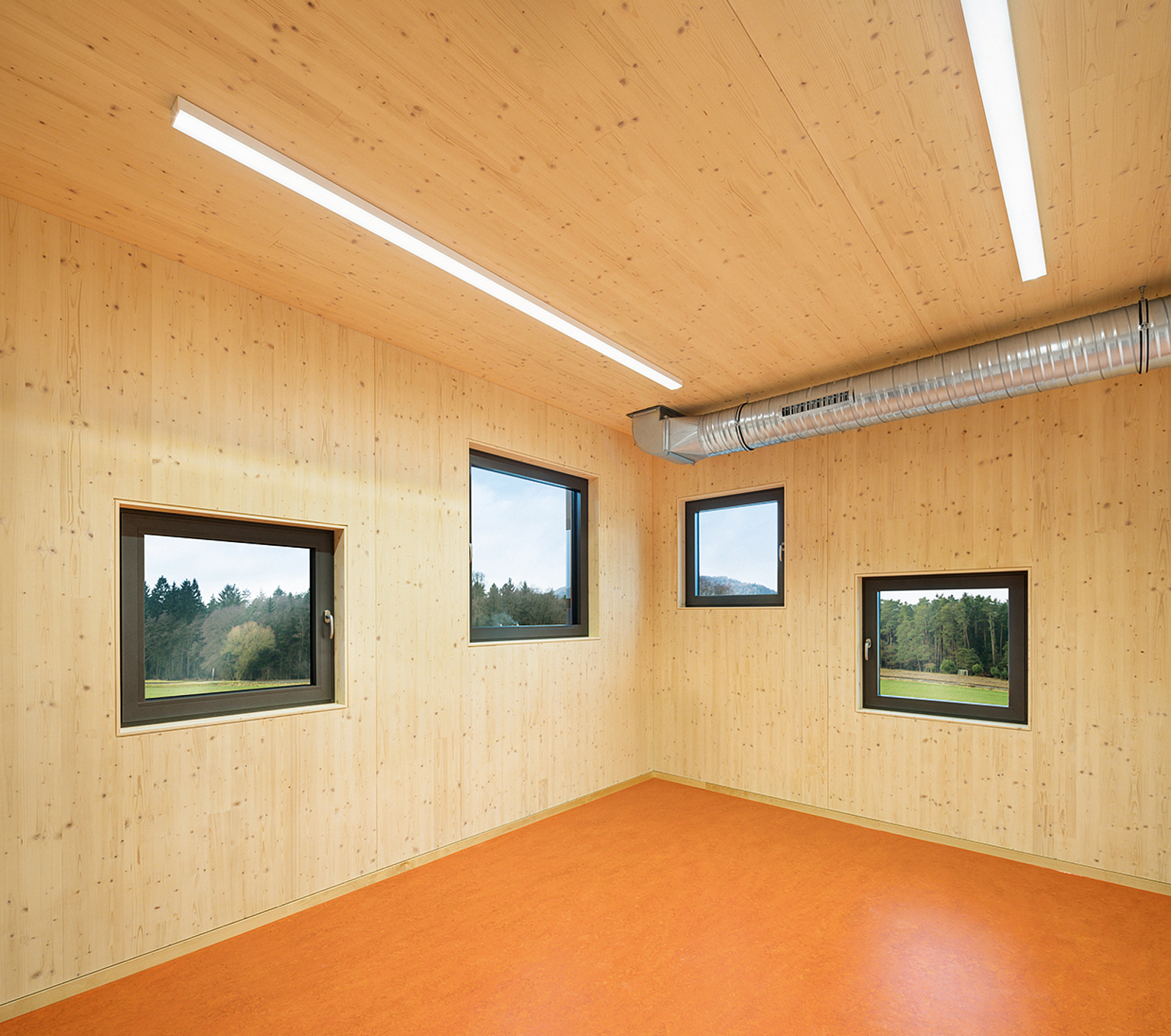Die tragende Wandkonstruktion besteht aus 12 cm starken fünflagigen Massivholzelementen aus der heimischen Fichte, die in weiten Teilen des Gebäudes komplett sichtbar bleiben.