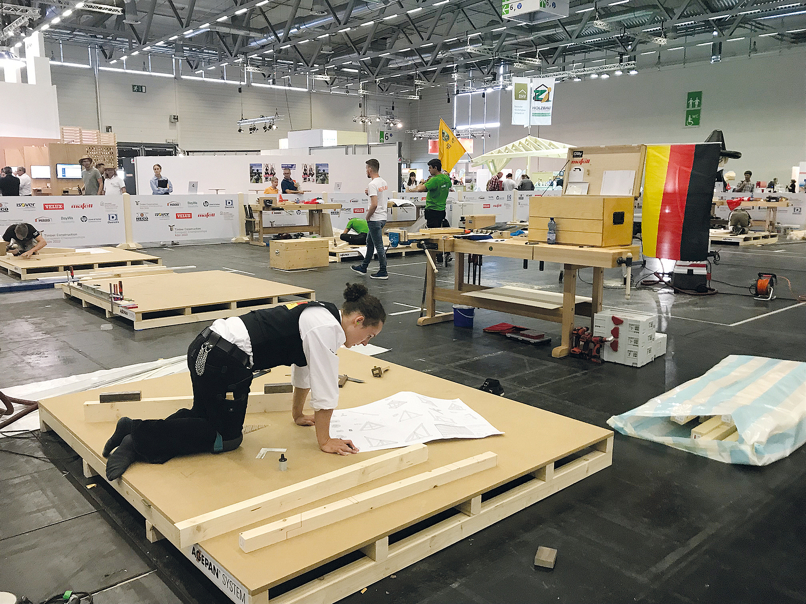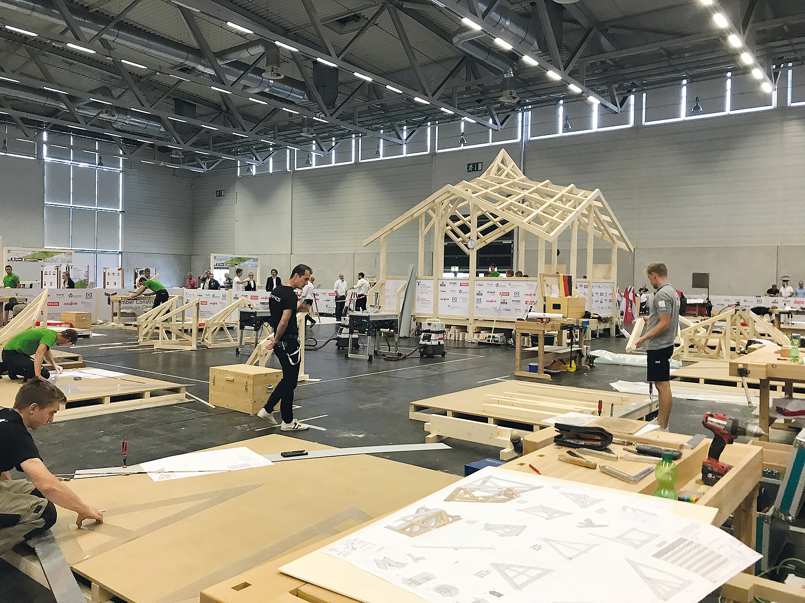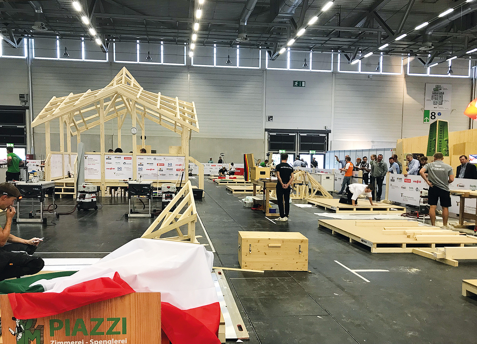 Während der vier Messetage stellten eine Zimmerin und 16 Zimmerer aus sieben europäischen Ländern ihren fachgerechten Umgang mit dem Baustoff Holz unter Beweis. In einem klar definierten Zeitrahmen mussten sie anspruchsvolle Holzkonstruktionen zimmern, die anschließend von einer europäischen Expertenjury bewertet wurden. Dabei ging es um Präzision beim Messen, Sägen und Zusammenbauen.