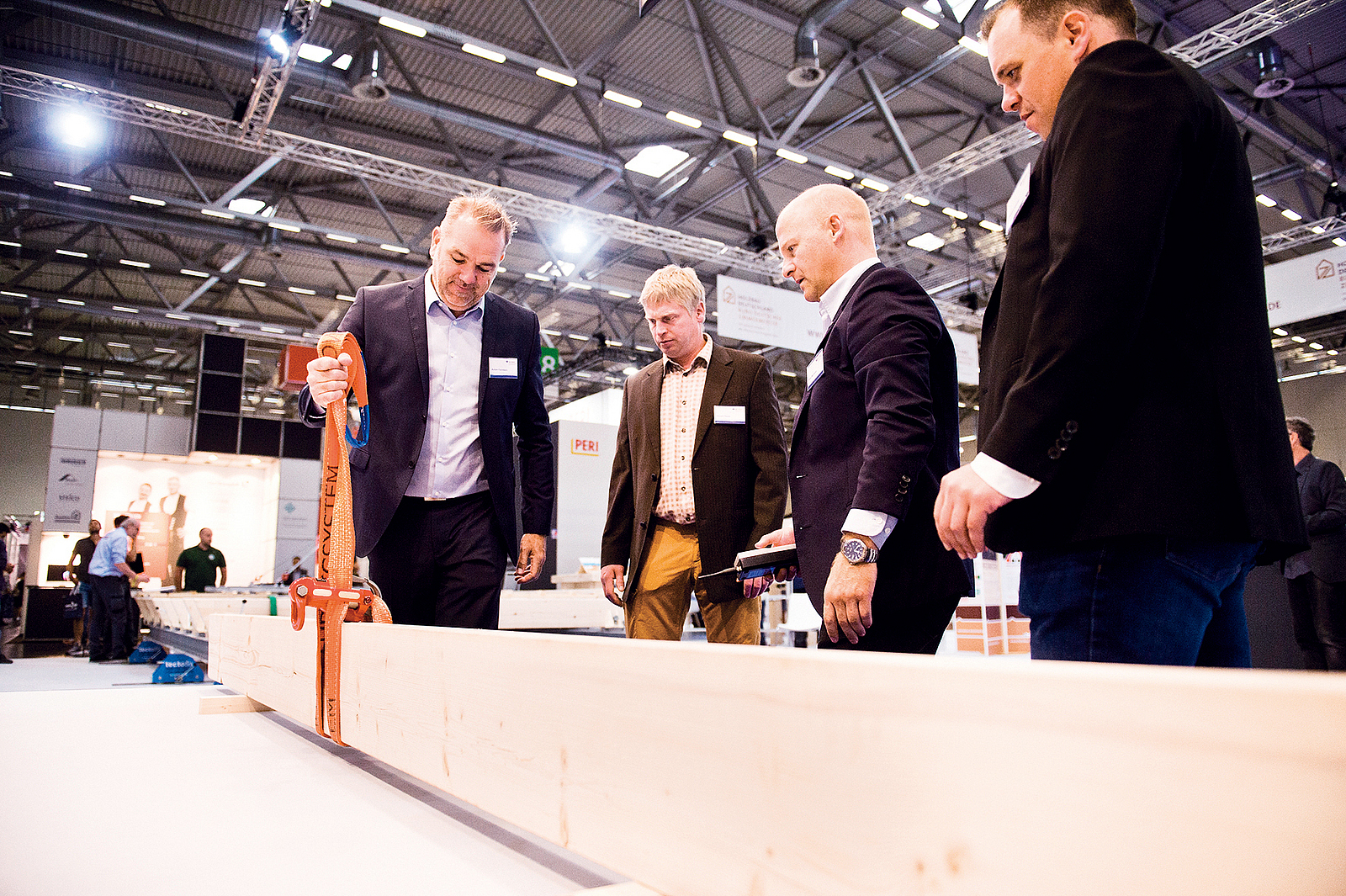 Ein Gerüst speziell für das Flachdach konnten die Teilnehmenden am darauffolgenden Stand kennenlernen. Durch das vom Hersteller entwickelte System bleibt das Flachdach stützenfrei, sodass die Abdichtung unkompliziert verlegt werden kann und keine Stolperfallen entstehen. Besonders interessant für Zimmerleute war der Stand, an dem eine Montageanlage für die Vorfertigung von Holzrahmenbauelementen präsentiert wurde. Mit einer Dachtraverse können Dachelemente sicher angehoben, verladen oder montiert werden, dafür werden mittels eines verschiebbaren Hakens die Latten als Anschlagmittel benutzt – es sind somit keine zusätzlichen Schlaufen notwendig.