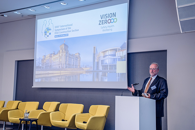 Michael Kirsch, stellvertretender Hauptgeschäftsführer der BG BAU, betonte in seinem Grußwort, dass Arbeitsunfälle und Berufskrankheiten immer Ursachen hätten: „Mit einer wirksamen Präventionskultur können wir diese Ursachen beseitigen und viel Leid verhindern. Die Vision-Zero-Strategie IVSS ist ein Ansatz, mit dem Unternehmen Sicherheit und Gesundheit bei der Arbeit in der Praxis umsetzen können.