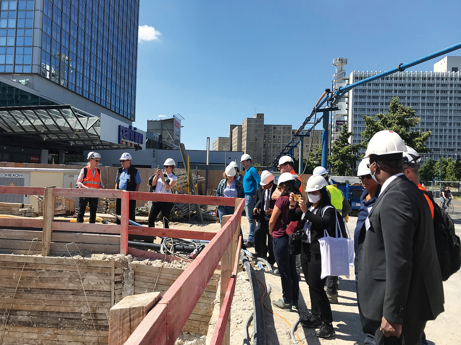 Zunächst schaute sich die Gruppe den Stand der Tiefbauarbeiten für das neue Covivio-Hochhaus neben dem Park Inn an. Der neue Gebäudekomplex wird aus einem ca. 36 m hohen Block sowie einem Hochhausturm an der Alexanderstraße bestehen. Vorgesehen ist eine gemischte Nutzung mit Büros, Wohnungen, Einzelhandel, Gastronomie und einer Kindertagesstätte. Beim Rundgang tauschten sich die Teilnehmerinnen und Teilnehmer mit den Bauleitern zum Stand der Spezialtiefbauarbeiten und natürlich zum Arbeitsschutz aus.