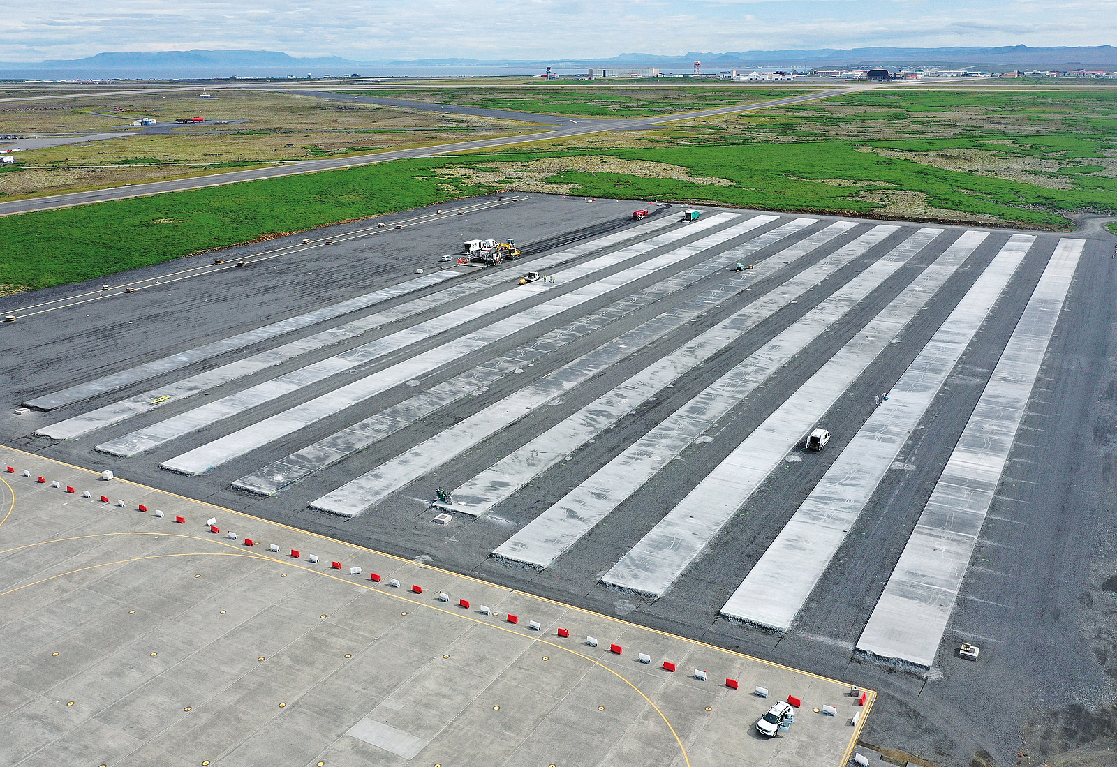Flughafen Keflavik/Island: Die Vorfeld-Erweiterung wurde in 31 Einzelbahnen hergestellt, die mit seitlich eingebrachten Ankern untereinander verbunden wurden.