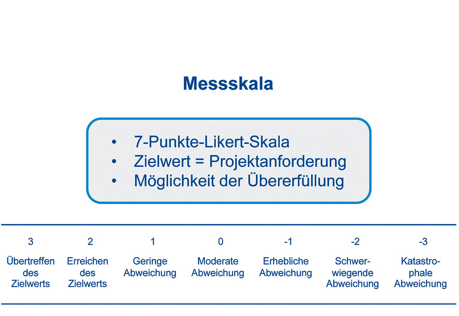 Als Mess-Skala für das Mess-System wird eine 7-Punkte-Likert-Skala gewählt (vgl. Abb. 1b), die als Zielwert die jeweilige Projektanforderung in den Blick nimmt und für quantitative wie qualitative Erfolgskriterien gleichermaßen anwendbar ist.