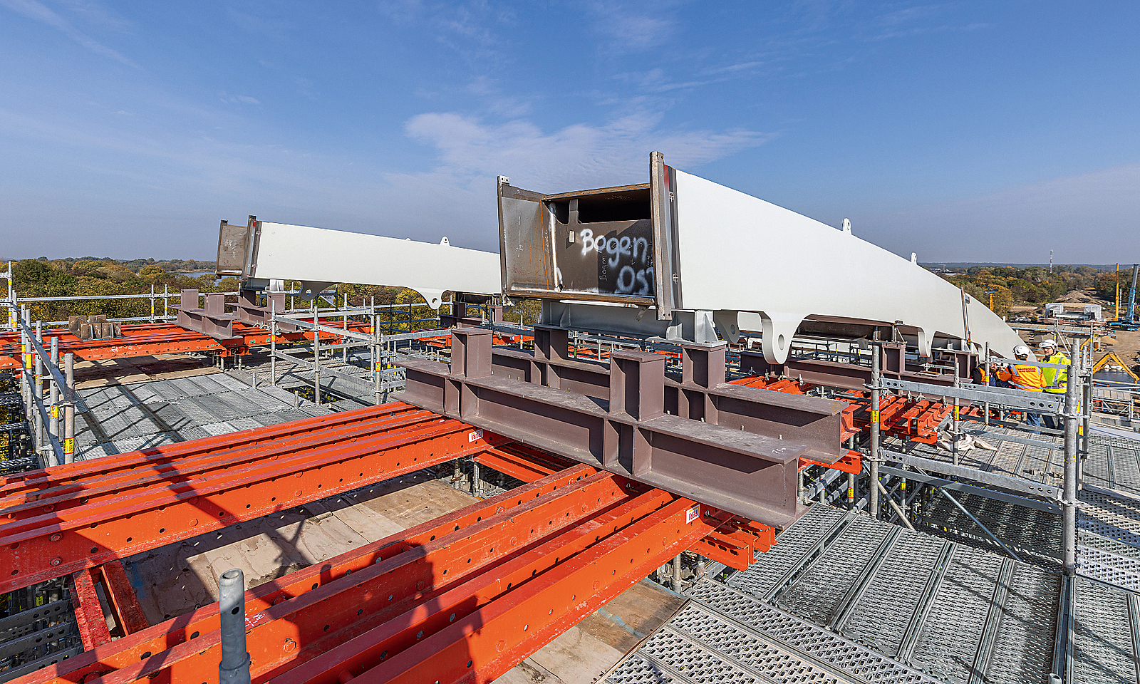 Eine projektspezifisch geplante Gerüstlösung und eine enge, ergebnisorientierte Zusammenarbeit aller Beteiligten sorgen dafür, dass der Bau der Oderbrücke Küstrin-Kietz trotz anfänglicher Anpassung der Bautechnologie sowie krisenbedingter Engpässe bei Baumaterial und Personal sichtbar voranschreitet.