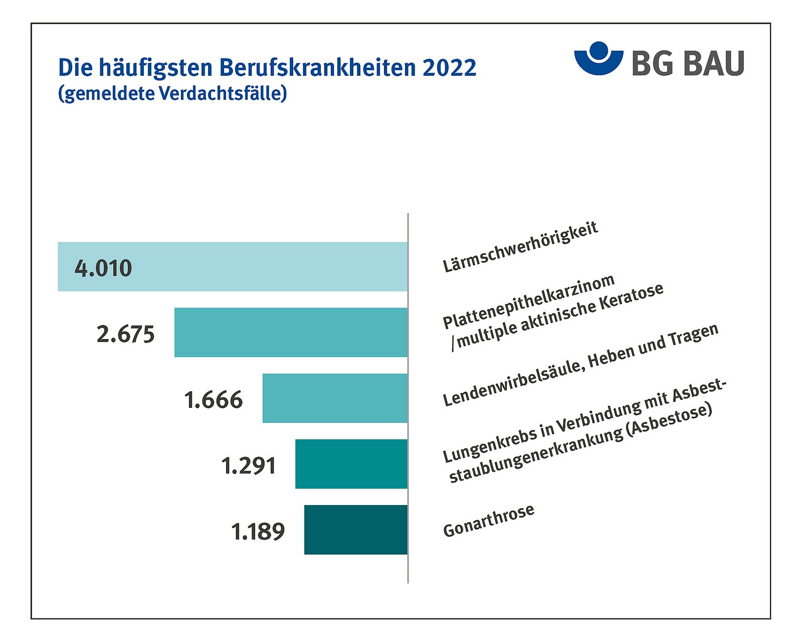 Wie die BG BAU in ihrer Jahrespresskonferenz am 20. Juni in Berlin mitteilte, sind im vergangenen Jahr die Arbeits- und Wegeunfälle in der Bauwirtschaft im Vergleich zu 2021 zurückgegangen. Demgegenüber gab es 2022 deutlich mehr gemeldete Berufskrankheiten als im Jahr zuvor. Zu den häufigsten Berufskrankheiten gehören Lärmschwerhörigkeit, weißer Hautkrebs durch Sonneneinstrahlung und Lungenkrebs durch Asbest.