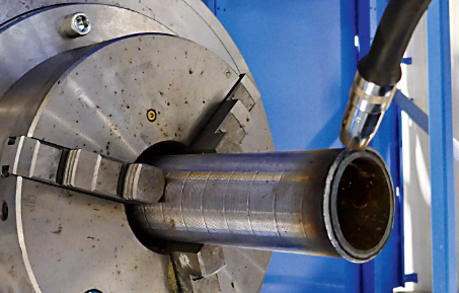 Während ohne Kühlung ein Abtropfen der Schmelze zu beobachten ist, gefährdet eine Kühlung über Luftdüsen am äußeren Umfang die Schutzgasabdeckung, sodass die aufgeschweißten Raupen geometrisch deutliche Unregelmäßigkeiten aufweisen. Zielführend ist dagegen eine Kühlung durch Luftströmung im Inneren des Rohrs mittels Luftdruckverstärker, wodurch eine für den Anwendungsfall ausreichende Endkonturnähe erreicht wird.