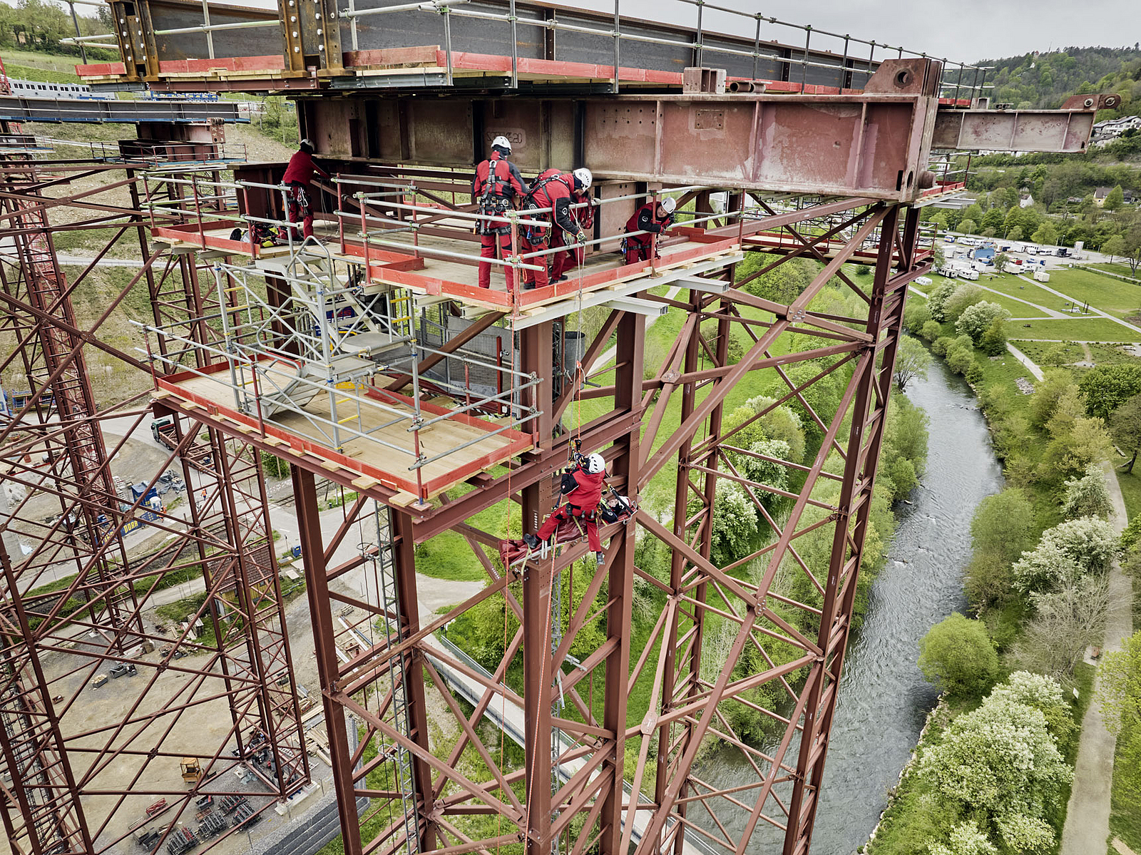 Die Baustelle der bis 90 m hohen Neckartalbrücke ist bis zum Spätsommer 2024 Schauplatz für Rettungsübungen regionaler Feuerwehren. Nachdem das Überwachungsaudit für die SCCP-Zertifizierung an der Hochbrücke Horb mit Bravour bestanden wurde, stellte das Bauunternehmen Porr seine Baustelle für Trainingszwecke zur Verfügung.