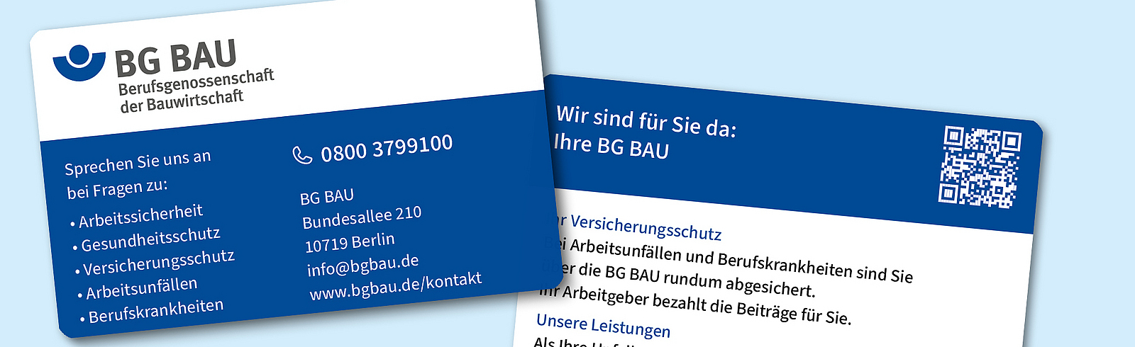 Die BG BAU-Karte enthält Informationen über die BG BAU, eine Kontaktmöglichkeit und Kernaussagen zum Auftrag der gesetzlichen Unfallversicherung. Mit der Karte wissen alle Mitarbeiterinnen und Mitarbeiter im Notfall – z. B. beim Durchgangsarzt nach einem Arbeitsunfall – wer ihr zuständiger Unfallversicherungsträger ist.