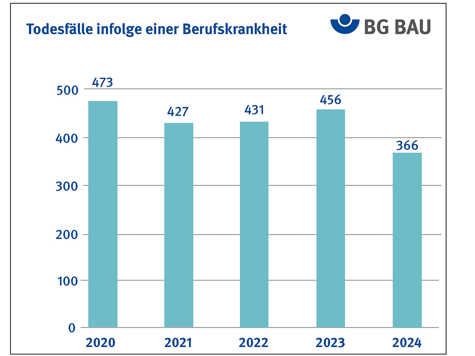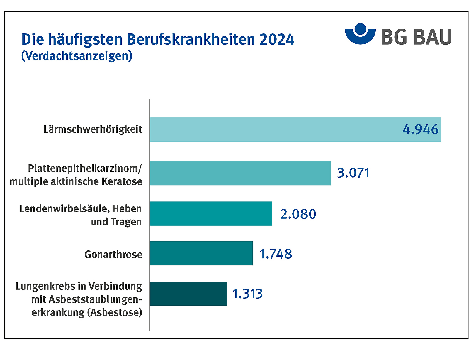 Sorgen bereitet der BG BAU die wachsende Zahl an Berufskrankheiten. Über 21.000 Verdachtsmeldungen (7 % mehr als 2023) wurden eingereicht. Besonders häufig sind Anzeigen mit dem Verdacht auf Lärmschwerhörigkeit, Hautkrebs durch UV-Strahlung oder asbestbedingten Erkrankungen. Im vergangenen Jahr starben 366 Versicherte der BG BAU an den Folgen einer Berufskrankheit.