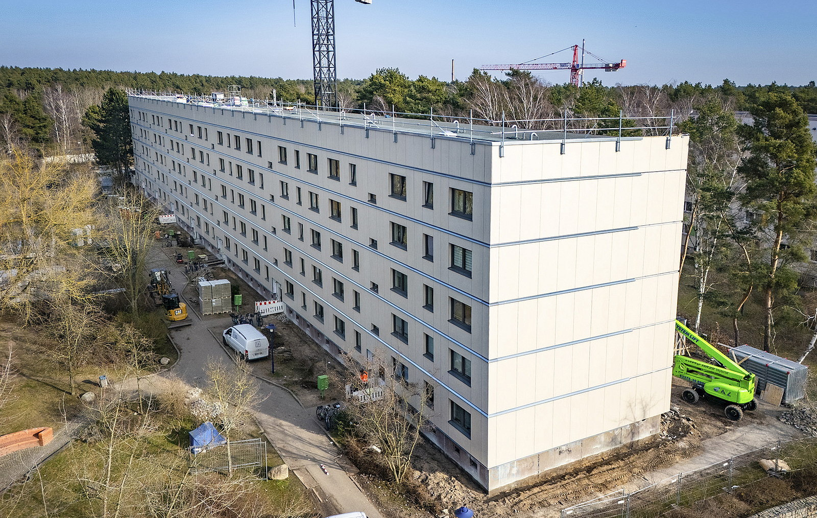 - Einbau von 228 vorgefertigten Fassadenelementen aus Holz mit Wärmedämmung, dreifach verglasten Fenstern und Faserzement-Oberfläche