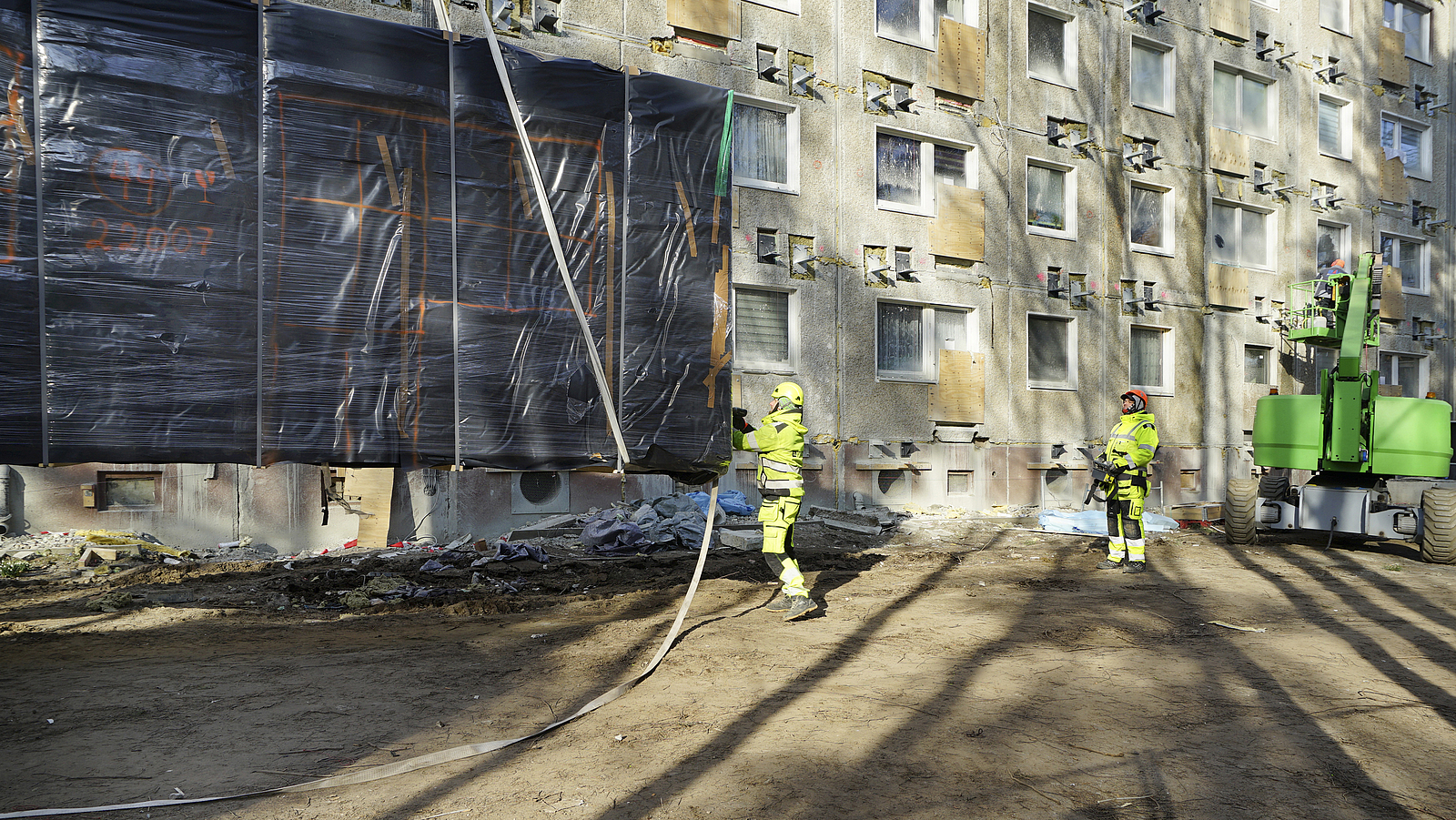 Bei der energetischen Sanierung treten Gefährdungen vor allem bei der Montage der vorgefertigten Elemente auf. So ist z. B. bei der Montage von Fassadenelementen von Gerüsten aus darauf zu achten, dass es nicht zu Abbzw. Durchstürzen zwischen Gerüst und Fassade kommt. Denn beim Aufstellen des Gerüsts sind die Abstände zwischen Gerüst und Fassade im ungedämmten Zustand größer als nach dem Anbringen der gedämmten Elemente. Für das Aufstellen von Fassadengerüsten gelten konkrete technische Regeln. Der Abstand zwischen Bauwerk und Gerüstbelag darf höchstens 30 cm betragen. Steht das Gerüst in größerem Abstand zur Fassade, können Innenkonsolen eingesetzt werden, die den Abstand auf das maximal erlaubte Maß verringern. Geschieht dies nicht, ist es notwendig, einen zweiteiligen Seitenschutz nach innen zu montieren. Empfehlenswert ist auch der Einsatz von Hubarbeitsbühnen, wie auch hier in der Albert-Schweitzer-Straße. Darüber hinaus ist auch bei der Montage von Photovoltaikmodulen, beim Aufbau der Unterkonstruktionen sowie der Vorbereitung der Dachflächen vor Montage darauf zu achten, dass sowohl elektrotechnische Grundsätze berücksichtigt als auch erforderliche Absturz- und Durchsturzsicherungen angebracht werden.
