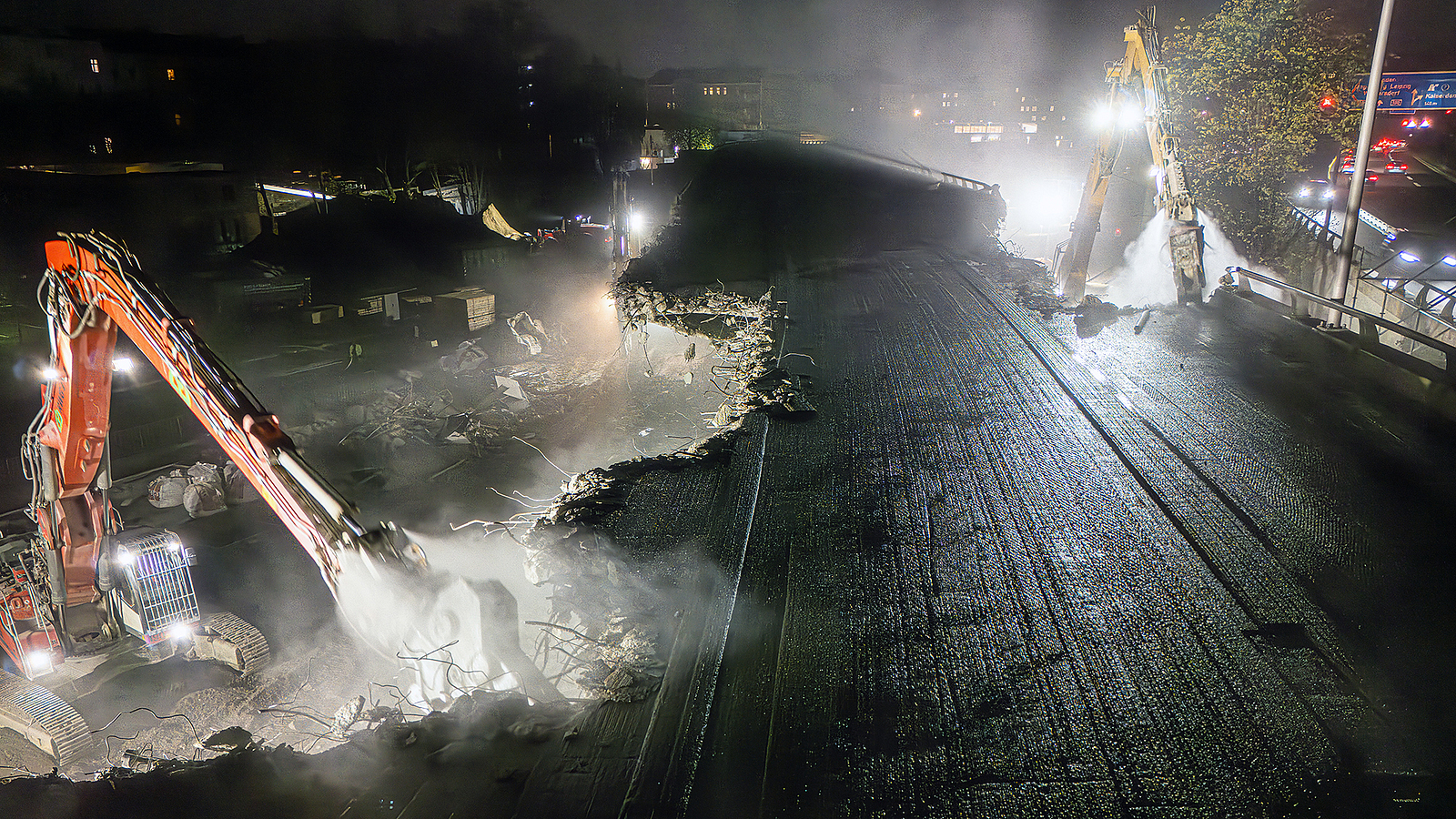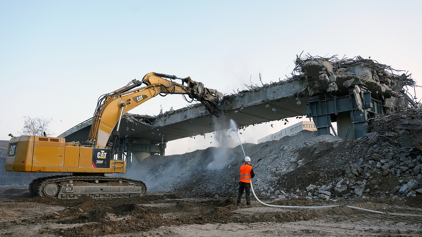 Frederic Schulz war als Aufsichtsperson der BG BAU regelmäßig auf beiden Baustellen, um die Verantwortlichen zu Schutzmaßnahmen für Beschäftigte, Anwohner und Verkehrsteilnehmer in der unmittelbaren Umgebung zu beraten. Gegen die Staubausbreitung wässerten Beschäftigte mit Nebelkanone und Spritzschlauch die Abbruchstellen kontinuierlich. Die für den Abbruch eigentlich günstigen Wetterbedingungen ohne nennenswerte Niederschläge erhöhten den Wasserbedarf allerdings zusätzlich. Wasserdüsen an den Abbruchwerkzeugen befeuchten das aufgebrochene Material an Ort und Stelle, um den Staub direkt am Emissionsherd zu binden, bevor er sich in der Umgebung großflächig ausbreiten konnte.