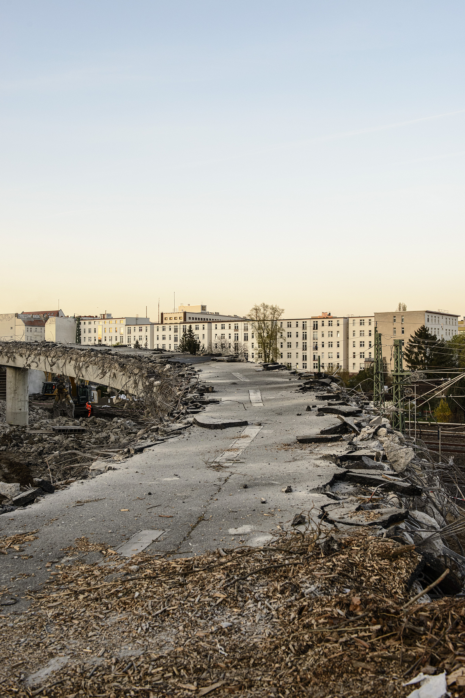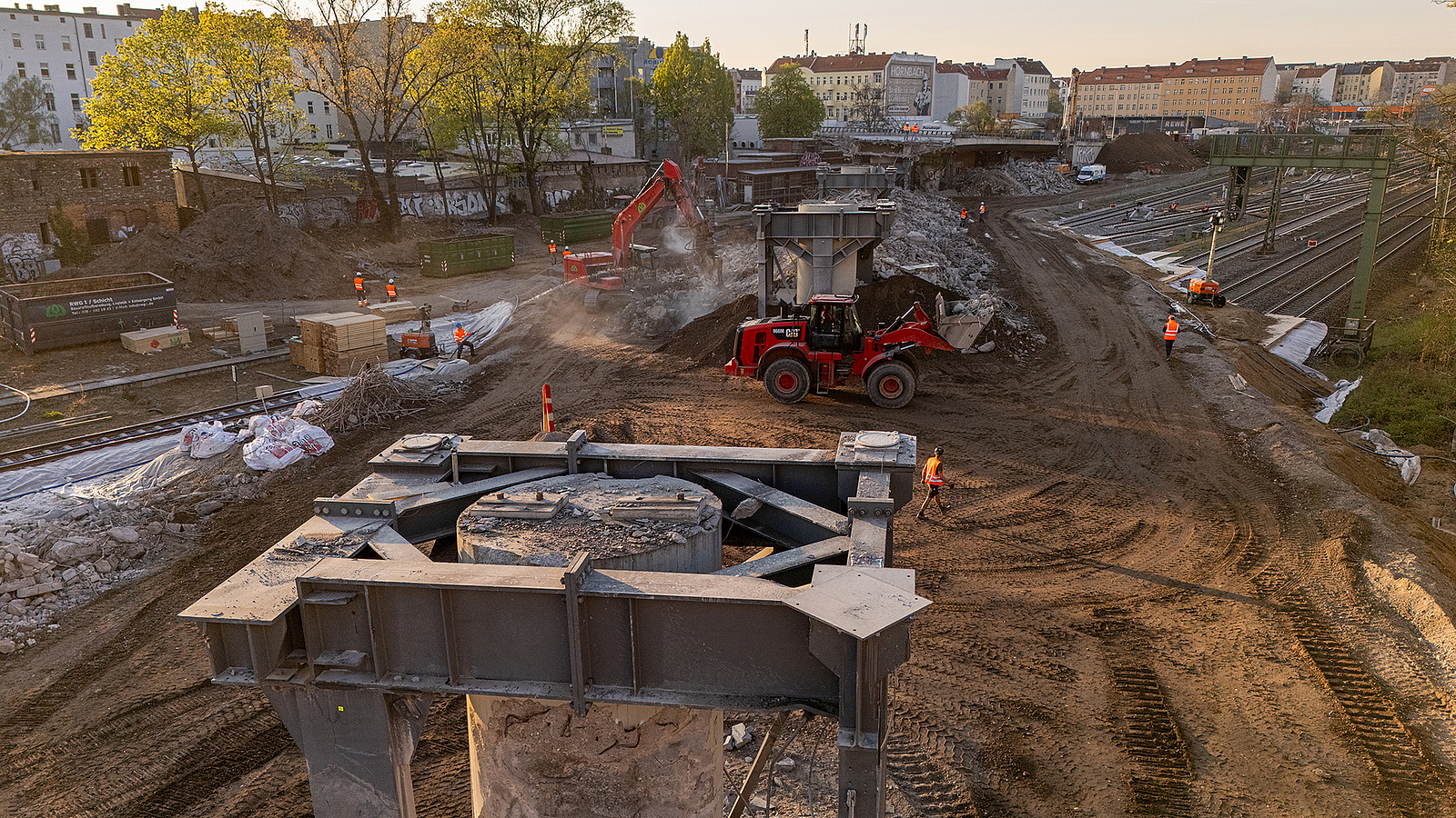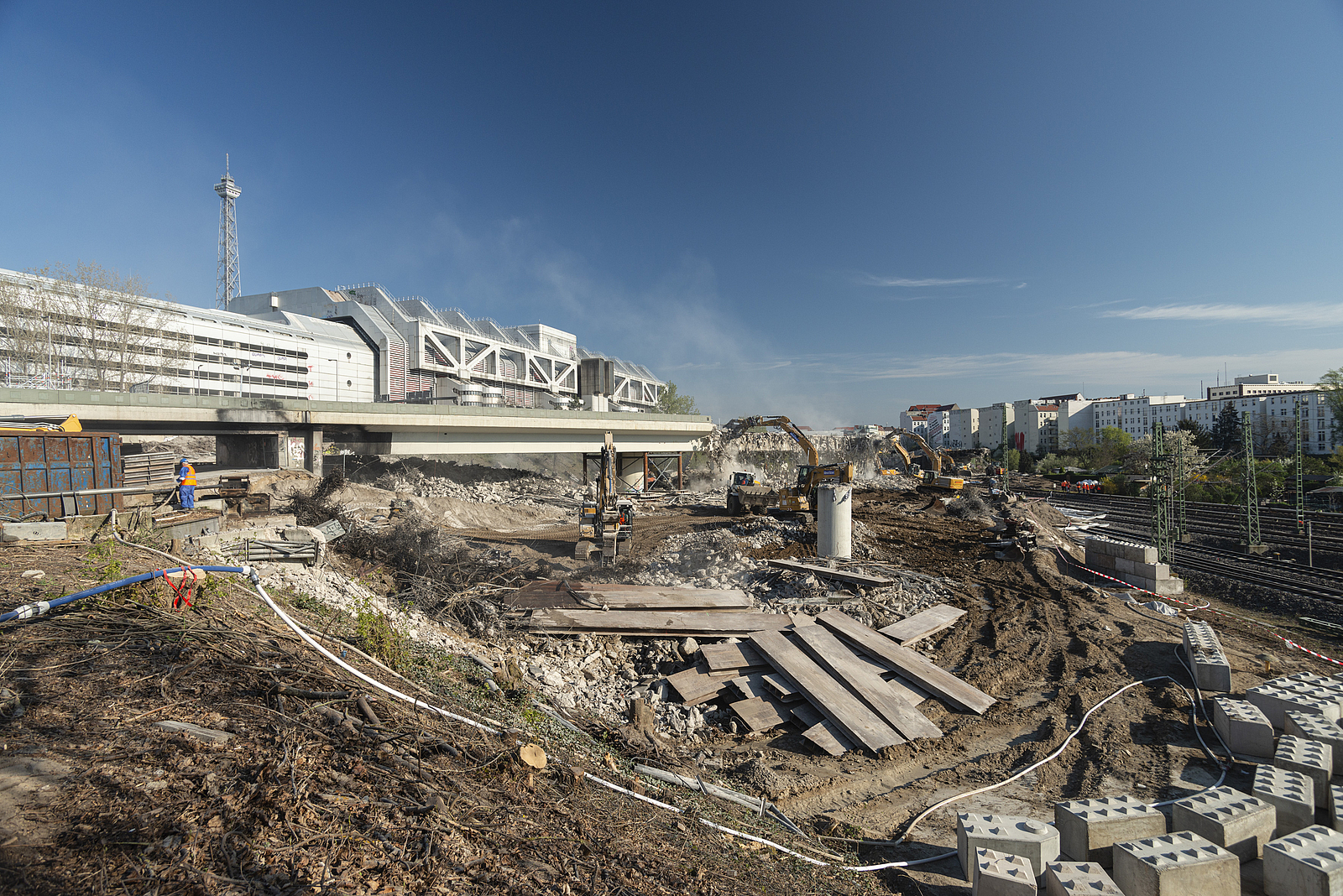 Die Gleisbereiche unter und neben den Brücken waren mit Holzbohlen und Stahlplatten gesichert, damit sie für Abbruchbagger und Transportfahrzeuge schadlos befahren werden konnte und tonnenweise Abbruchmaterial standhielten.