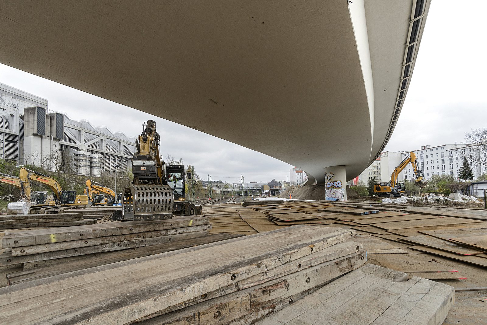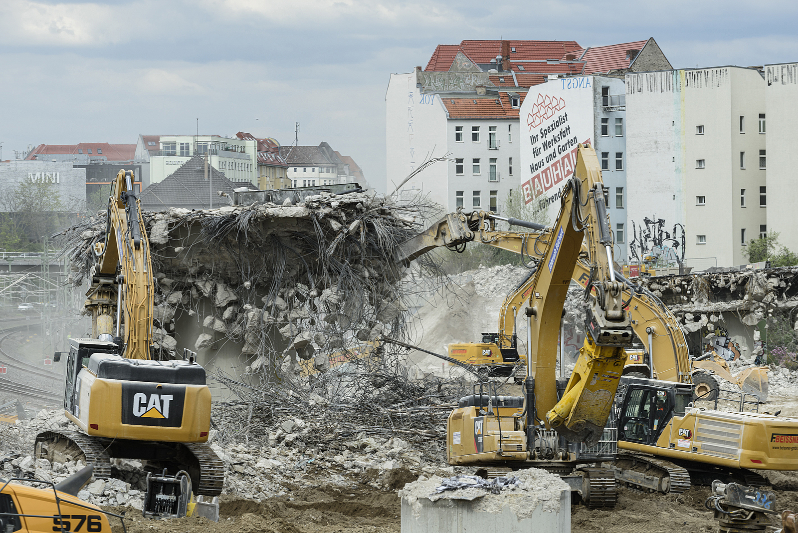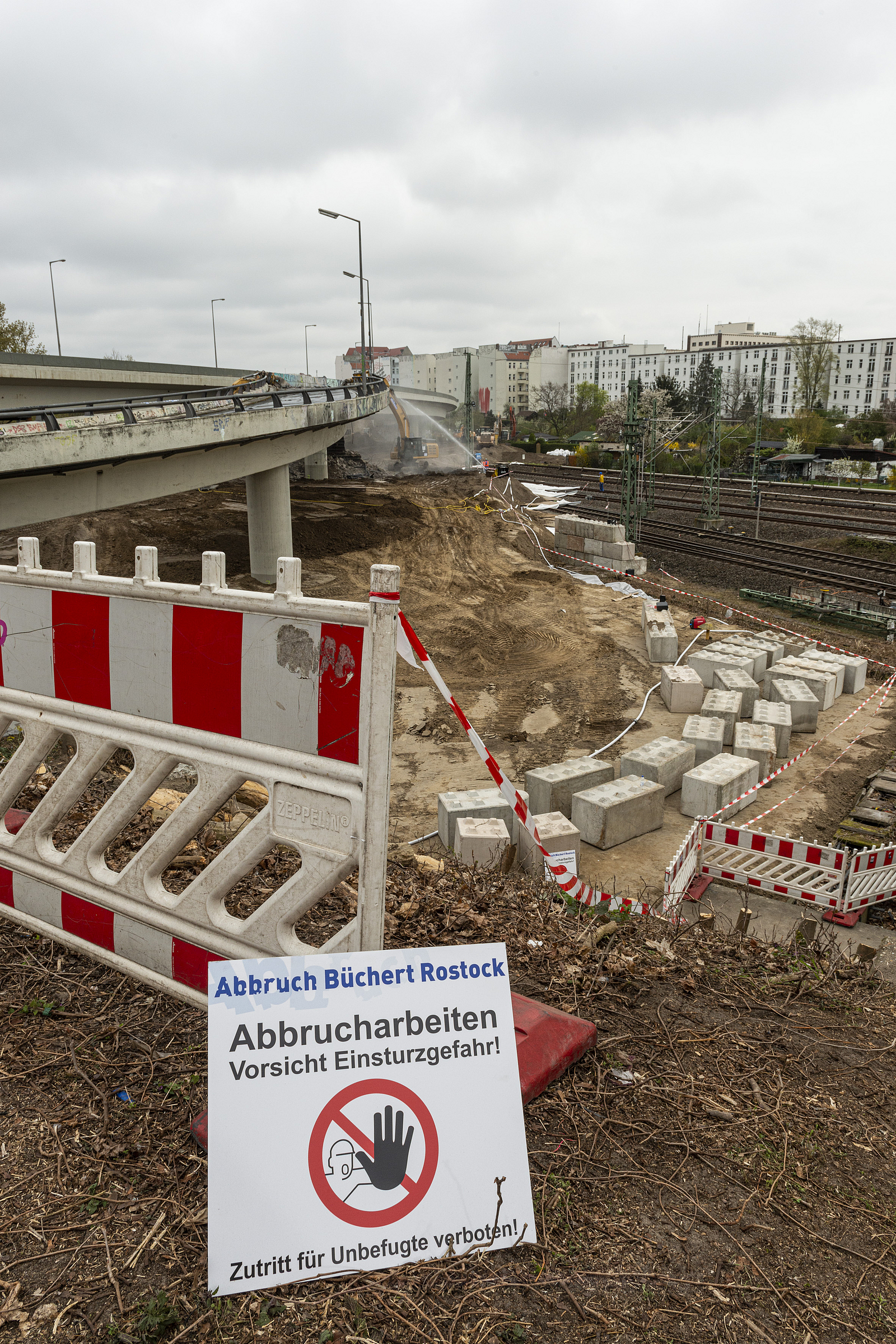 Die Gleisbereiche unter und neben den Brücken waren mit Holzbohlen und Stahlplatten gesichert, damit sie für Abbruchbagger und Transportfahrzeuge schadlos befahren werden konnte und tonnenweise Abbruchmaterial standhielten.