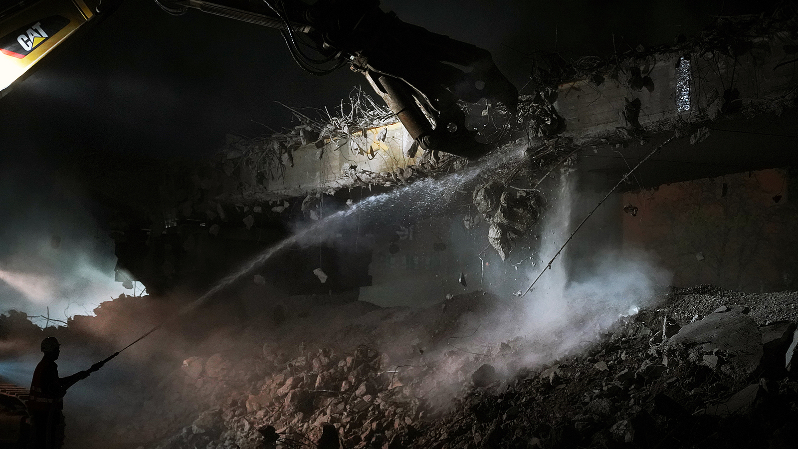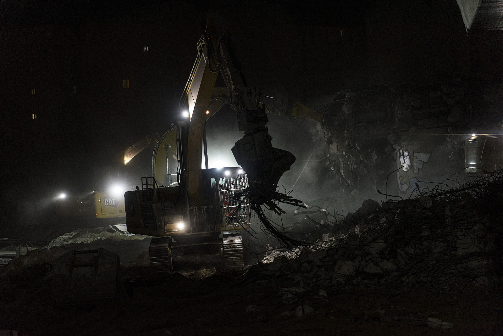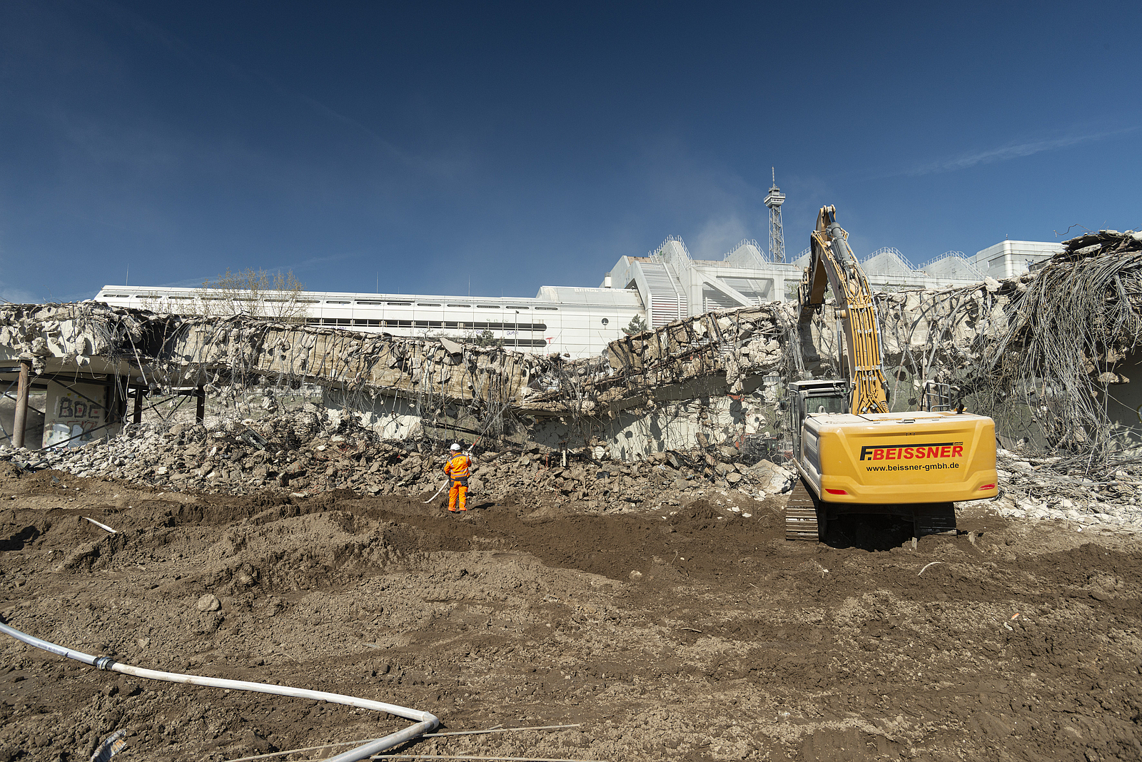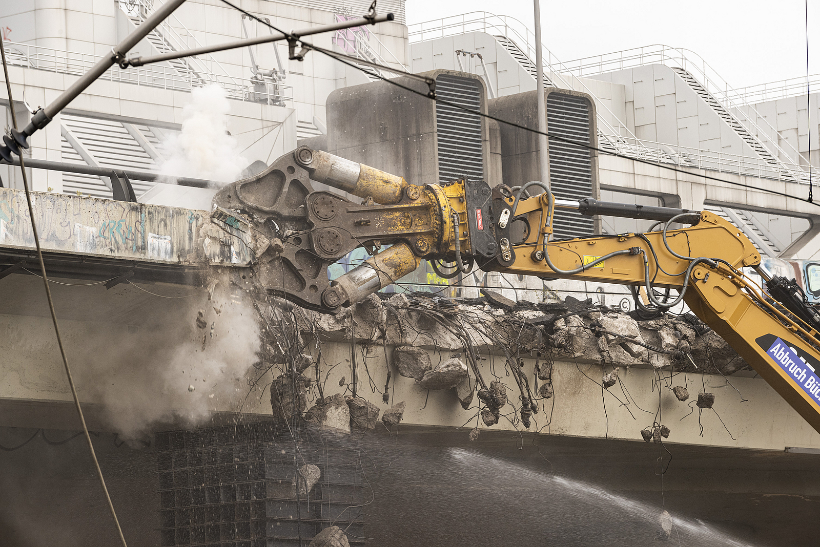 Abrissarbeiten in dieser Dimension sind zwangsläufig eine staubige Sache. Wasserdüsen an den Abbruchwerkzeugen können die Staubentwicklungen etwas auffangen.