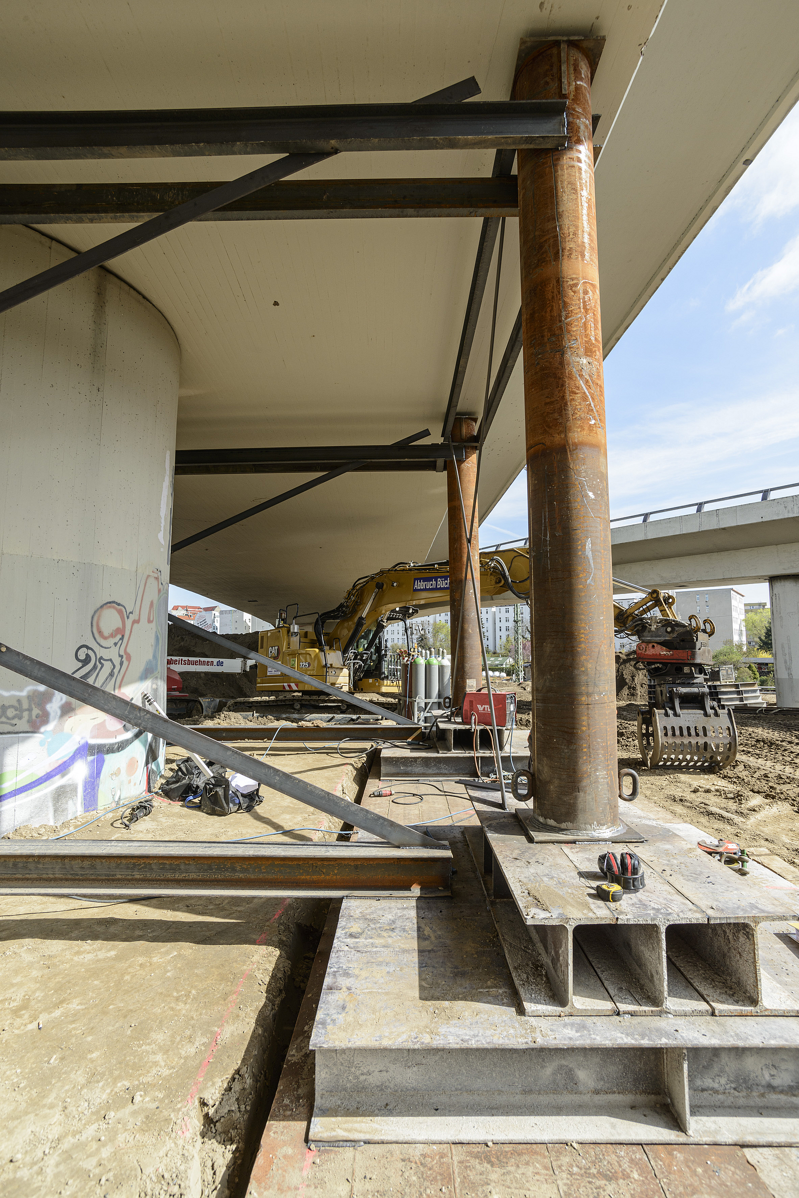 Damit waren die Flächen frei, um die Gleisanlagen für den Abriss zu sichern und Notstützen zu errichten, die einem unkontrollierten Zusammenbruch der maroden Brücke im Zuge der Abbrucharbeiten vorbeugen sollten. Zunächst wurden die Gleise mit Vlies überdeckt und mit Holzbohlen eingehaust. Dieser Aufbau wurde mit Stahlblechen abgedeckt. Darauf wurde ein Sandbett aufgetragen, das sowohl die schweren Baumaschinen tragen als auch (kontrolliert) abbrechende Brückenteile auffangen und die darunterliegenden Gleise ausreichend schützen sollte.