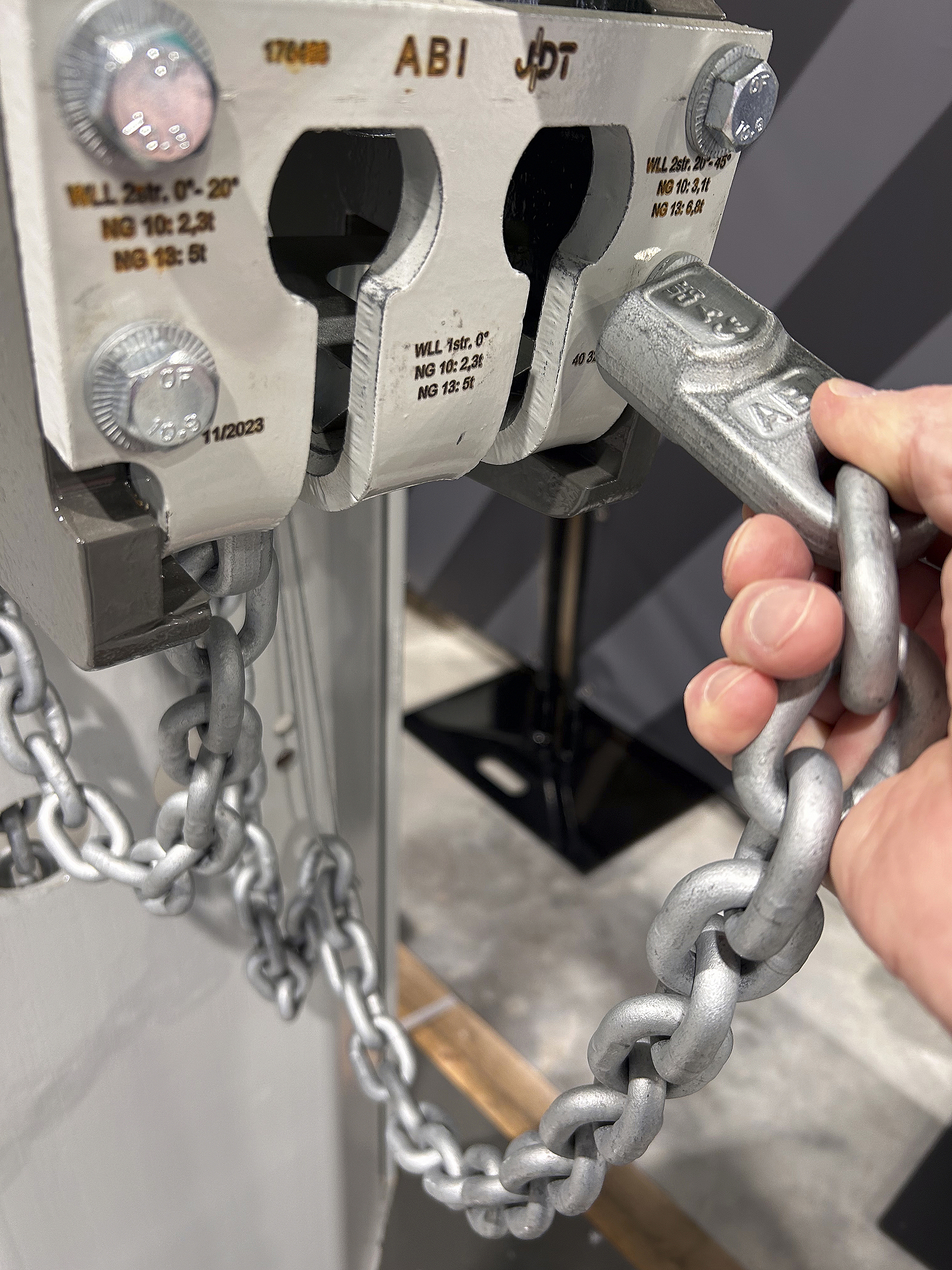Steht die Bohle aufrecht, wird sie in die Klemmzange geführt. Laut DIN EN 16228 muss die Klemmzange so gefertigt sein, dass das Einfädeln der Bohle z. B. durch Führungsplatten oder Abschrägungen erleichtert wird. Der kraftschlüssige Griff erfordert laut BetrSichV und Norm eine Sicherung – etwa mit Ketten. Um die erwähnten Probleme mit Knebeln und die resultierenden Unfälle zu vermeiden, haben Fachexperten der BG BAU gemeinsam mit dem Maschinenhersteller ABI Gruppe eine neuartige Anschlagsicherung mit hohem Wirkungsgrad entwickelt. Anstatt eines Knebels muss nun eine Kugel-/Schlüsselkonstruktion durch das Loch in der Bohle gefädelt werden und kann nicht mehr an der Bohle verbleiben. Durch eine Steck- und eine Drehbewegung wird sie im Schloss an der Klemmzange arretiert.