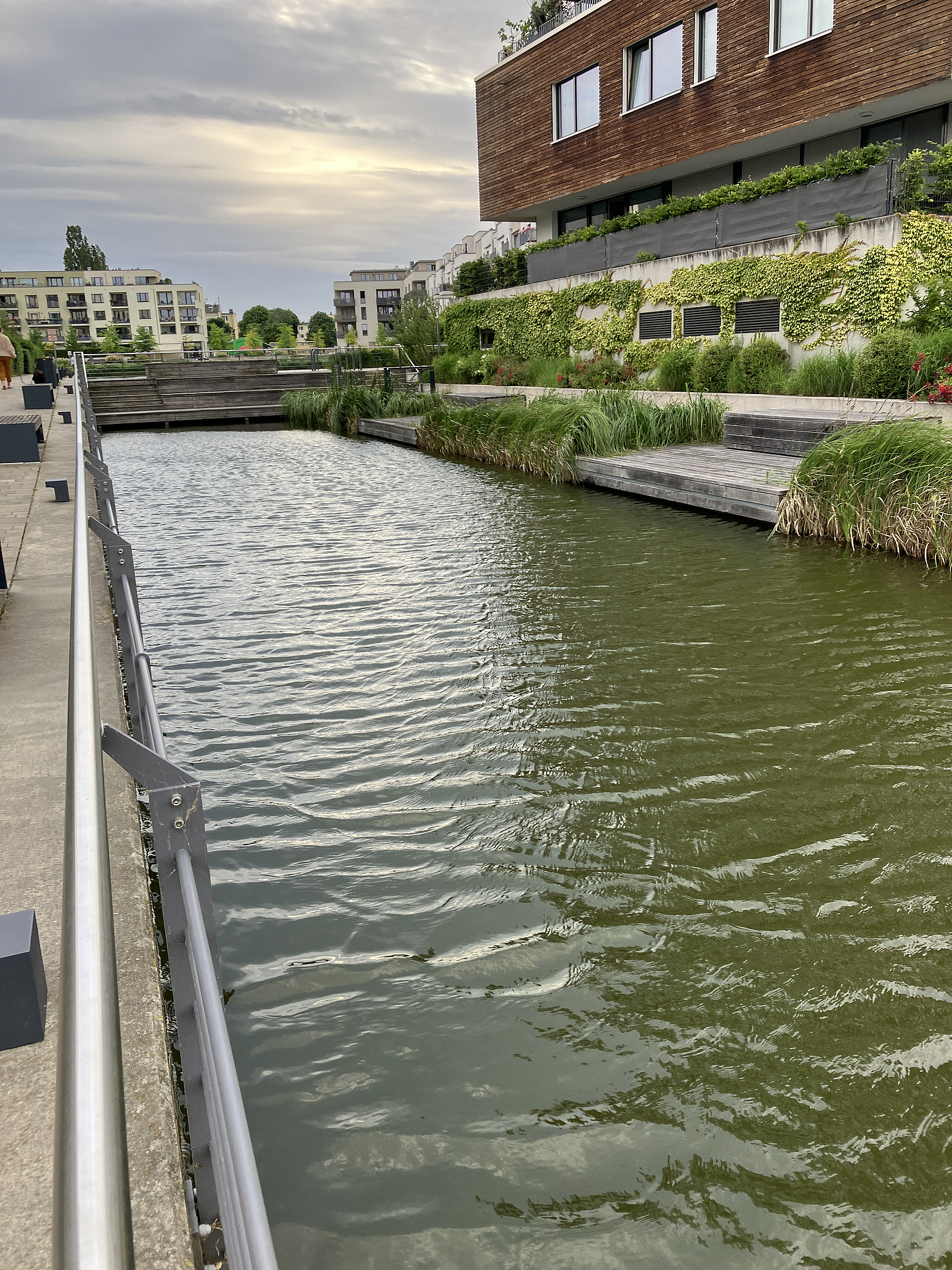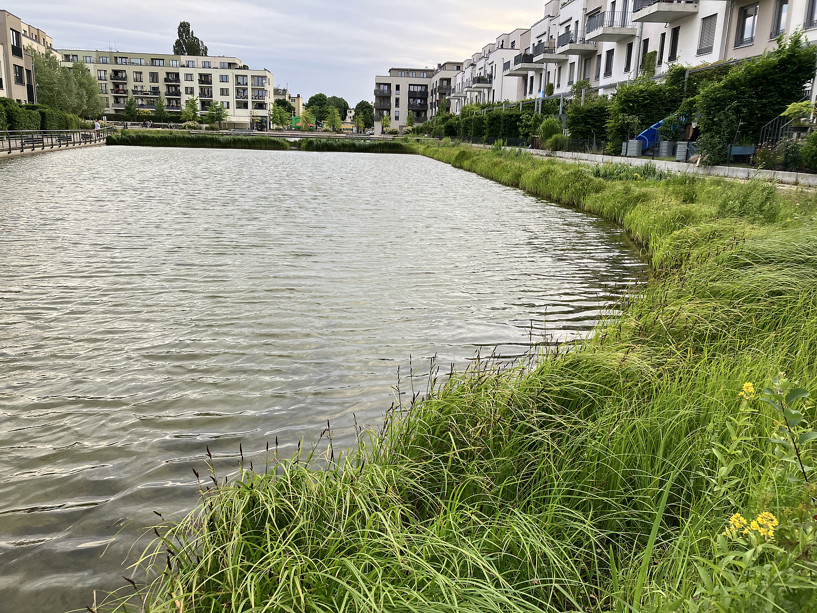 Das insgesamt 190 m lange und 6.000 m2 große trapezförmige Wasserbecken soll nicht nur das Element Wasser den Bewohnern in der ersten Reihe sicht- und erlebbar zu machen, sondern nimmt das Regenwasser der umliegenden Gebäude und Flächen auf.