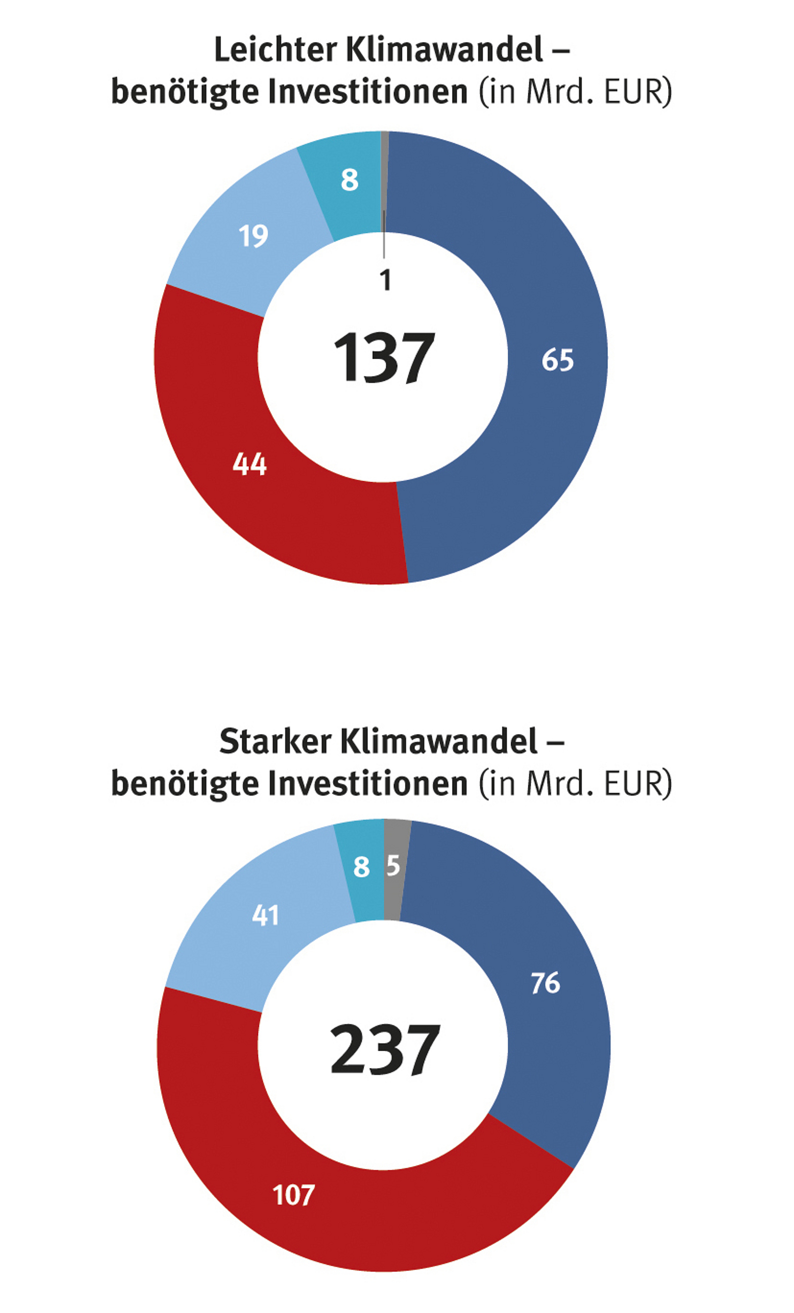 Zusätzlicher Investitionsbedarf um Gebäude zukünftig für verschiedene Auswirkungen des Klimawandel in gemäßigter (o.) und starker Ausprägung auszustatten.