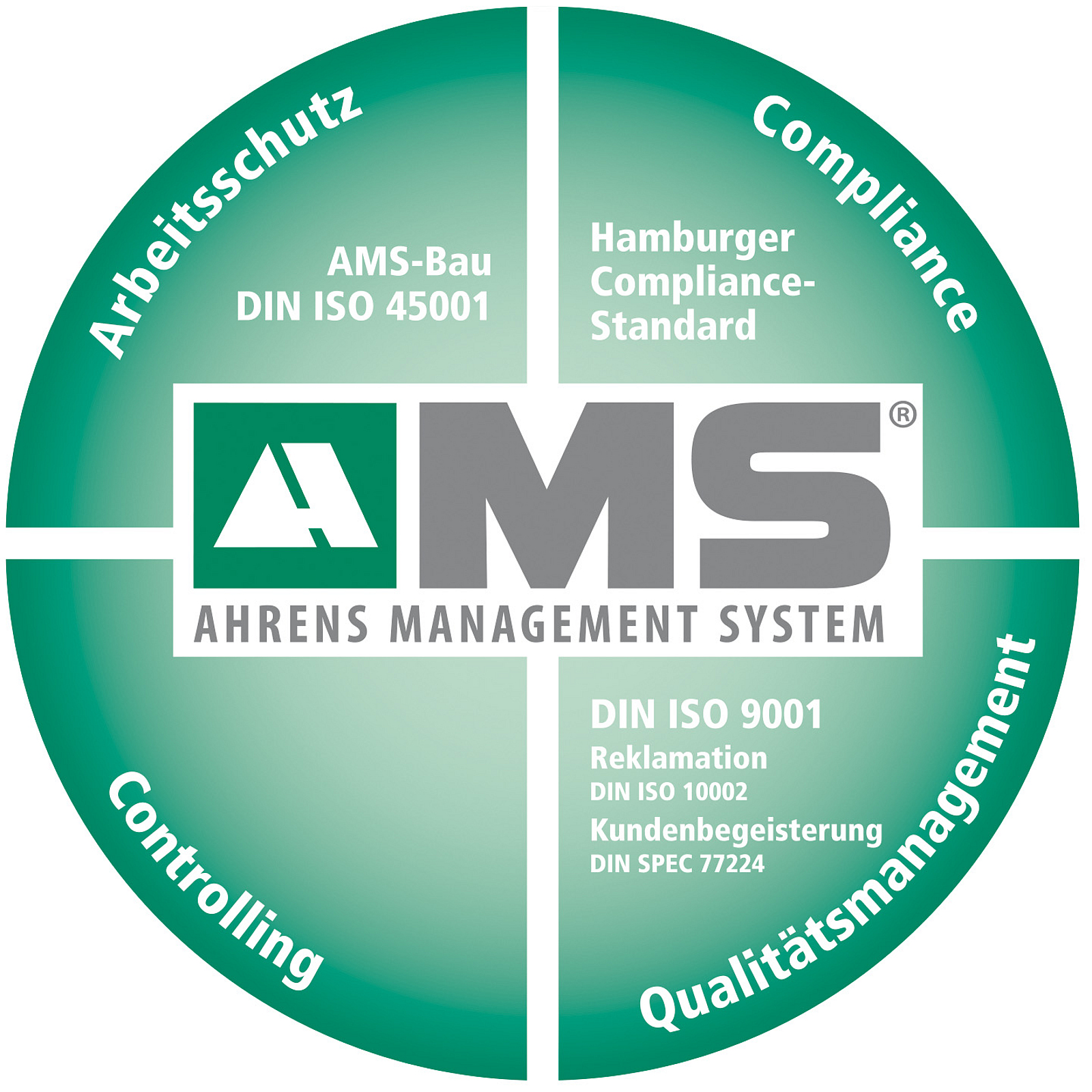 Inzwischen haben wir unser Ahrens Management System nach DIN ISO 9001:2015 und dem Hamburger Compliance-Standard durch Dritte zertifizieren lassen. In diesen Kontext stellt das kostenlose Angebot der BG BAU, auch aufbauend auf einer AMS-BAU-Begutachtung die Einhaltung der Forderungen der DIN ISO 45001 zu überprüfen, für uns eine sinnvolle Ergänzung innerhalb des Ahrens Management Systems dar.