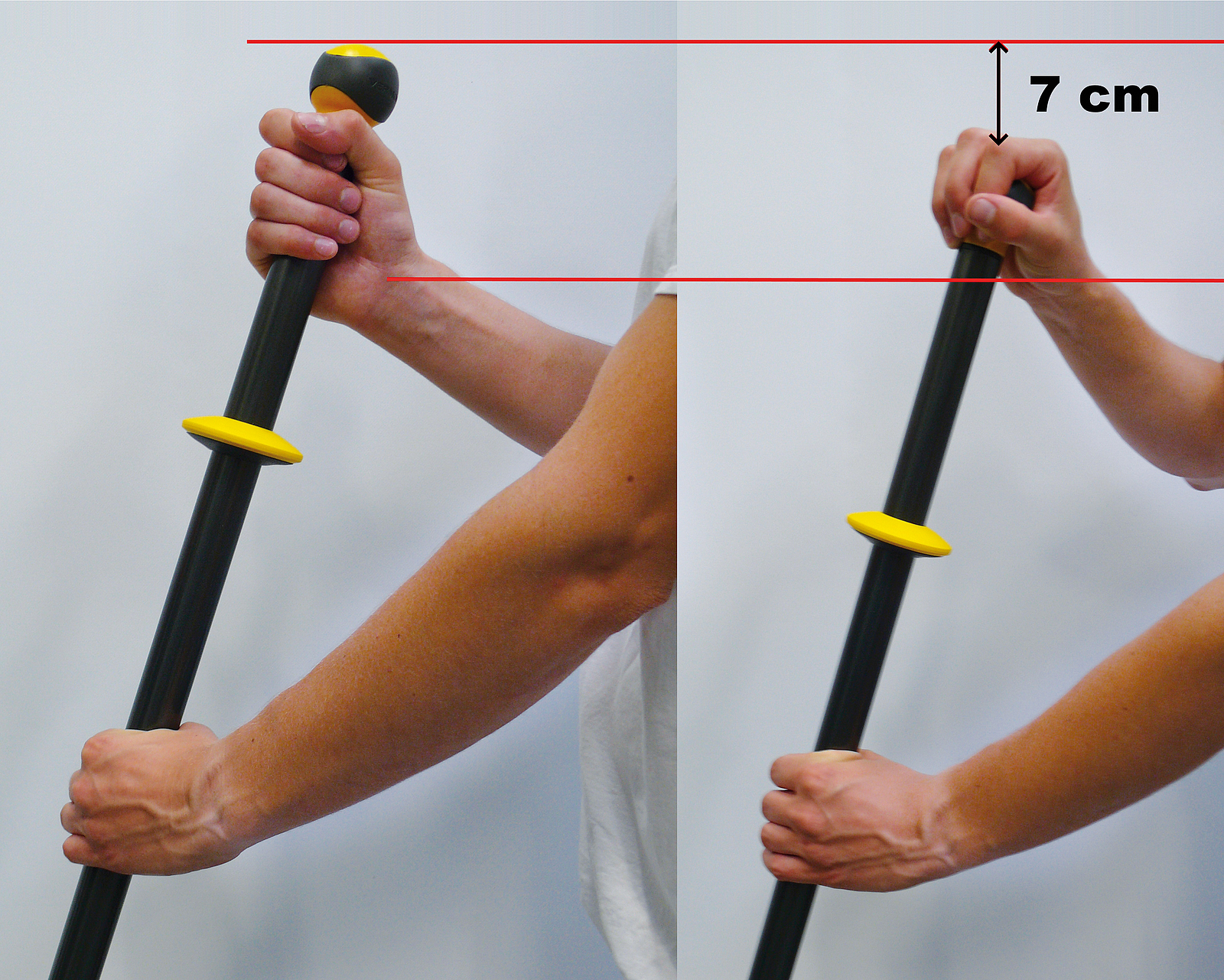 Verschiedene Greifmöglichkeiten bei Stielen mit einem drehbaren Knauf/Griff können bei entsprechender Handhabung eine Reduktion oder zumindest eine gleichmäßigere Verteilung der grundsätzlich hohen Belastungen für den Hand-, Arm- und Schulterbereich bei der manuellen Bodenreinigung hervorrufen. Das Greifen eines drehbaren Knaufs von oben (Abb. 2, rechts) bewirkte im Vergleich zum seitlichen Greifen des Stiels (Abb. 2, links) eine neutralere Handgelenkshaltung. Beim Greifen von oben (z. B. Stiel 2 und 3) sollte der Stiel entsprechend um einige Zentimeter verkürzt werden (abhängig von der Form des Knaufs und der Position des Handgelenks, siehe Abb. 2), um ein unnötiges zusätzliches Anheben des Arms zu vermeiden.