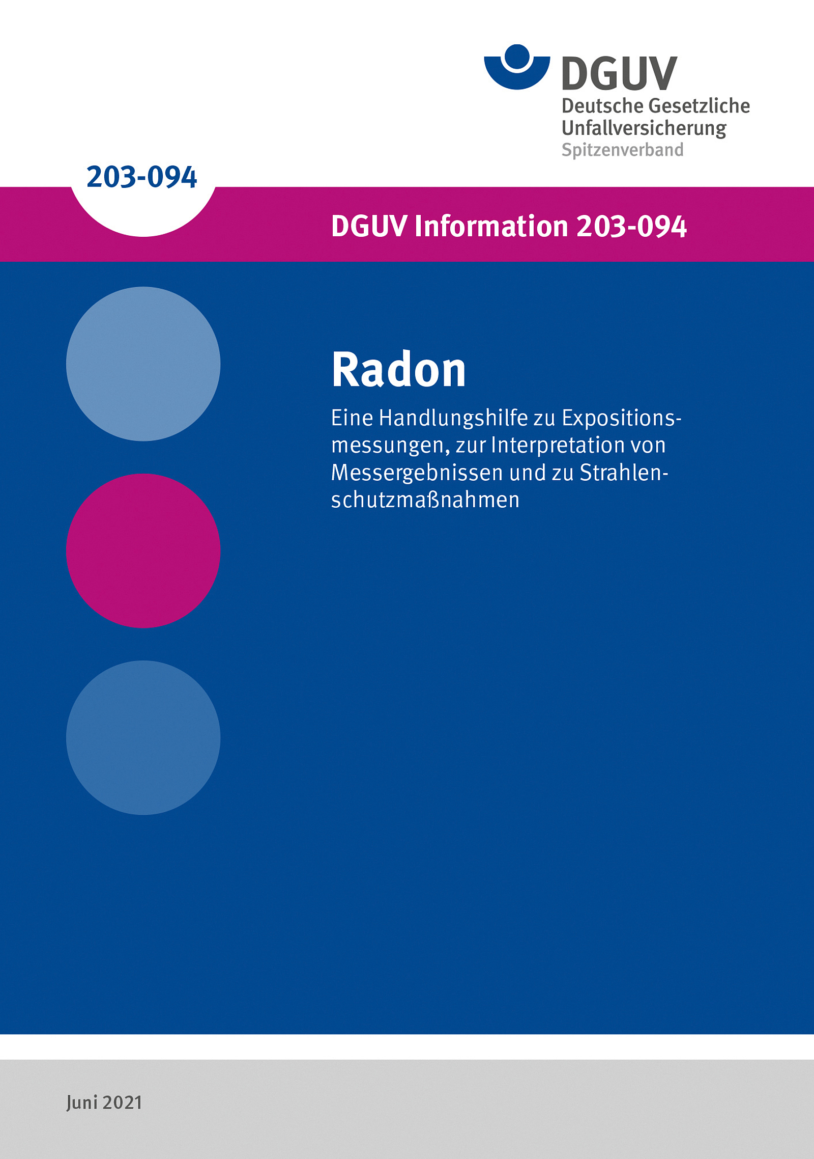 Die DGUV Information 203-094 „Radon – eine Handlungshilfe zu Expositionsmessungen, zur Interpretation von Messergebnissen und zu Strahlenschutzmaßnahmen“ kann kostenfrei auf der DGUV-Webseite heruntergeladen werden. Sie bietet eine Übersicht über die gesetzliche Grundlage und stellt dar, was Radon ist, wer eine Radonkonzentrationsmessung durchführen muss, wie die Messergebnisse einzuschätzen sind und welche Schutzmaßnahmen ergriffen werden können.