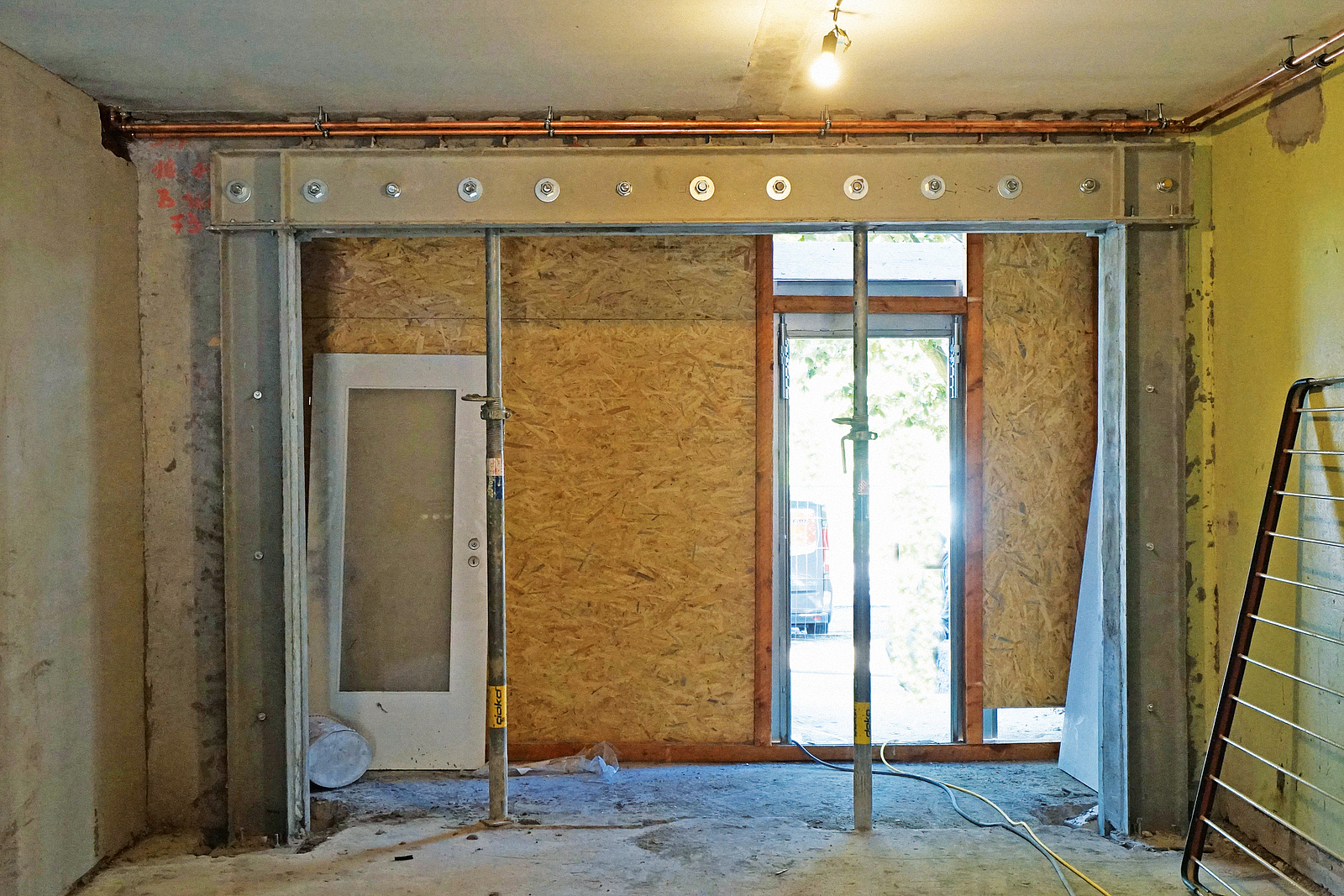 Als Bauleiter von SENATOR koordiniert Frank Jackenkroll derzeit etwa 115 Bau-Beschäftigte unterschiedlicher Gewerke und Nationen. In Kürze werden es sogar 130 sein, die hier gleichzeitig arbeiten. „Da ist permanente Kommunikation angesagt“, berichtet er, „um den technologischen Bauablauf genau und termingerecht einzuhalten.“ Vor allem geht es ihm dabei um strikte Sicherheit, um jegliche Unfälle auszuschließen, zweifellos eine Herausforderung bei so einem umfassenden Sanierungsgroßprojekt. Einige Details im Baubestand sind z. B. in den originalen Bauplänen von einst gar nicht enthalten. Auch die Grundrissänderungen sind nicht ohne: „Ich denke da an die Umgestaltung der Erdgeschosse. Wir müssen in den Eingangsbereichen gravierend in die Statik eingreifen, ersetzen tragende Wände durch Stahlkonstruktionen, die – je Eingangsbereich auf drei Stahlkonstruktionen verteilt – rund 128 Tonnen tragen müssen. Ein Prozess, bei dem die technologische Reihenfolge präzise eingehalten werden muss, damit niemand zu Schaden kommt. Jeder Arbeitsschritt wird dabei genau kontrolliert und abgesichert. Unterweisungen, Absprachen und Schulungen finden regelmäßig statt. Dazu stehen wir auch mit der Sicherheits- und Gesundheitsschutzkoordinatorin (SiGeKo), der Berufsgenossenschaft und dem Landesamt für Arbeitssicherheit in engem Kontakt“, führt Frank Jackenkroll aus.