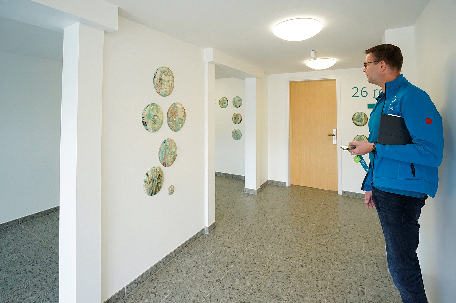 Die Eberswalder Verantwortlichen suchten bei der Sanierung auch nach Lösungen, die zwar keinen direkten Einfluss auf die Verbrauchswerte haben, dafür jedoch den CO2-Ausstoß rund um die Bewirtschaftung erheblich senken. Dazu gehört u. a. die installierte digitale Schließanlage. Sie ermöglicht eine kurzfristige Zutrittsvergabe per Transponder ohne kostenintensiven Mehraufwand. Bislang sind Hauseingangstüren und Gemeinschafsträume damit ausgestattet. Nach erfolgreicher Testphase sollen dann auch andere Türen im Haus folgen. Laut KIWI-Studie lassen sich mittels digitaler Schließsysteme in einem durchschnittlichen Mehrfamilienhaus mit zehn Wohneinheiten jährlich allein 70 kg CO2 einsparen. Die Systeme fördern Prozesse der Bewirtschaftung, lassen Störfälle sofort erkennen und Wartungen automatisch planen. Flächen und Räume werden optimal ausgenutzt. Die Bewirtschaftung wird einfacher und kostengünstiger.