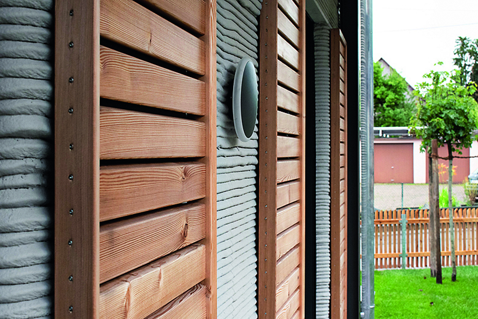 Das additive Verfahren ermöglicht Formen, die über klassische Bauweisen nur mit hohem Aufwand realisierbar wären – beispielsweise die runden „Ecken“. Der gerillten Fassade sieht man dabei deutlich die verschiedenen Schichten und damit ihre Herkunft im 3-D-Druck an, durch den sie entstanden ist.