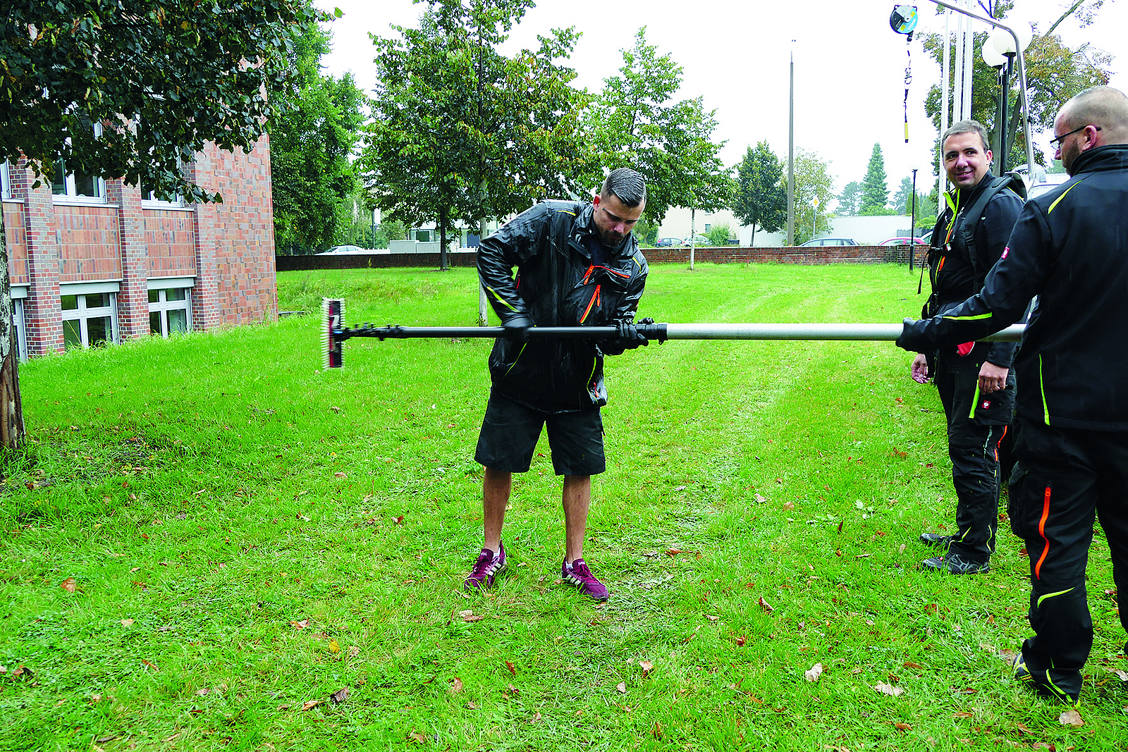 Die Glas- und Fassadenreinigung wird im Finanzamt Dessau jährlich von Philipp Lange und seinem Team an etwa vier Tagen durchgeführt. Beim letzten Termin Anfang Oktober 2021 kamen insgesamt drei Hubarbeitsbühnen zum Einsatz. Da sich die Hubarbeitsbühnen jedoch an einigen Stellen als recht platzintensiv erwiesen und nur mit großem Aufwand aufgestellt werden konnten, setzte das Reinigungsunternehmen für Höhen bis 15 m parallel Teleskopstangensysteme ein.