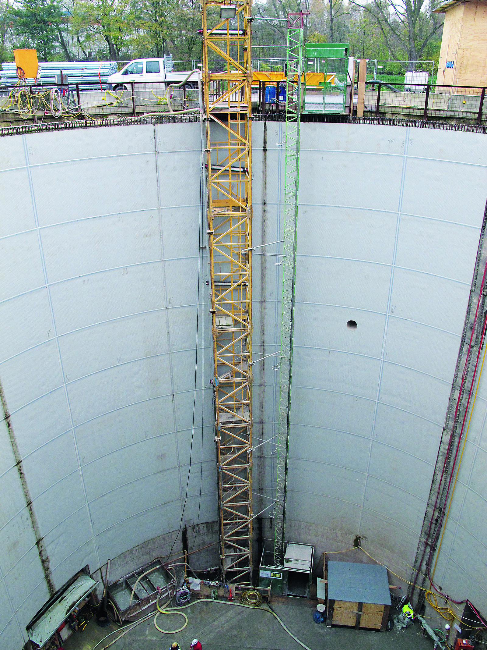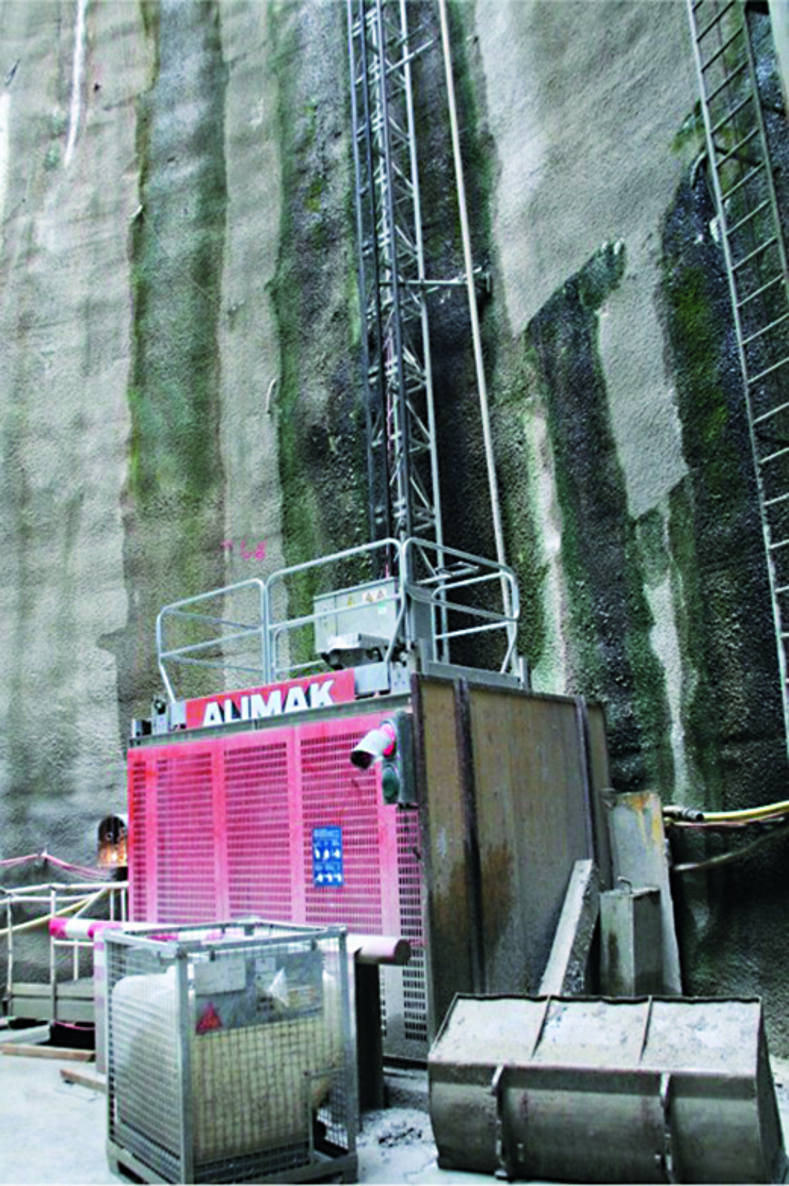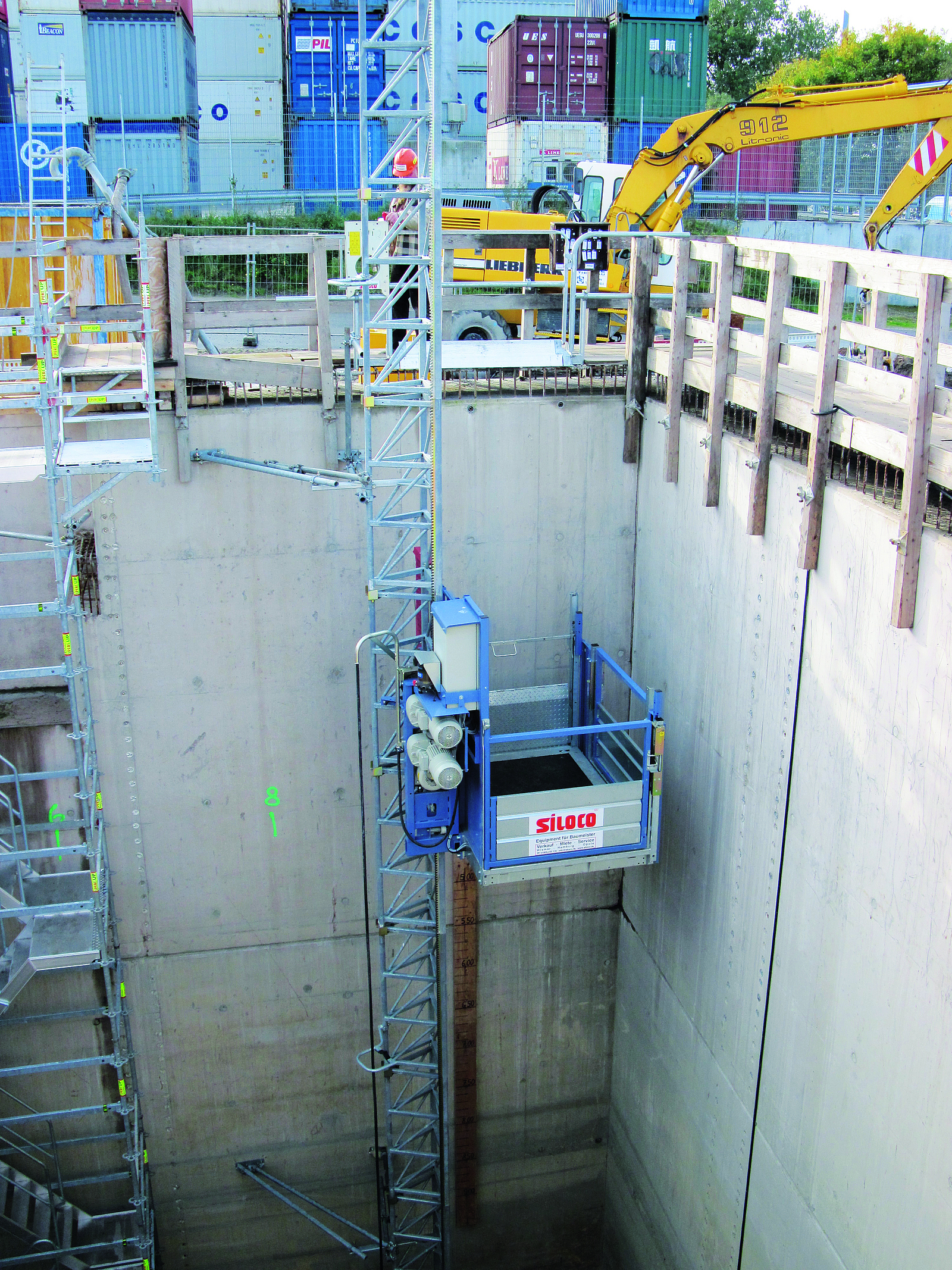 Als Verkehrsweg in die fertiggestellten Baugruben und Schächte stellen Bauaufzüge eine Alternative dar. Hierbei ist zu bedenken, dass grundsätzlich ein zusätzlicher energieunabhängiger Fluchtweg vorhanden sein muss, z. B. ein Treppenturm. Infrage kommen reine Personenaufzüge oder Baustellenaufzüge, mit denen Personen und Material transportiert werden können (Transportbühnen). Beide Aufzugsarten gehören zu den überwachungsbedürftigen Anlagen und sind daher vor der Inbetriebnahme und danach regelmäßig durch eine zugelassene Überwachungsstelle zu prüfen.[4] Bei Baustellenaufzügen besteht die Gefahr, dass Beschäftigte bei einer Betriebsstörung (z. B. Stromausfall) im Aufzug eingeschlossen werden. Für diesen Fall sind ein entsprechender Notfallplan und eine Notbefreiungsanleitung aufzustellen.[5] Eine wesentliche Voraussetzung für die Befreiung ist, dass vom eingeschlossenen Personal die erforderliche Hilfe herbeigerufen werden kann.[6] Da der Aufzugskorb im Rahmen der Befreiung auf den Boden der Baugrube bzw. des Schachts abgelassen wird, muss ein zusätzlicher Zugang/Fluchtweg installiert sein, damit das Personal die Baugrube bzw. den Schacht über diesen Zugang gefahrlos verlassen kann. Entsprechend der jeweiligen Baustellensituation kann es erforderlich sein, die Aufzugsanlage mit einer eigenen Notstromversorgung auszurüsten (siehe Abb. 4 und 5).