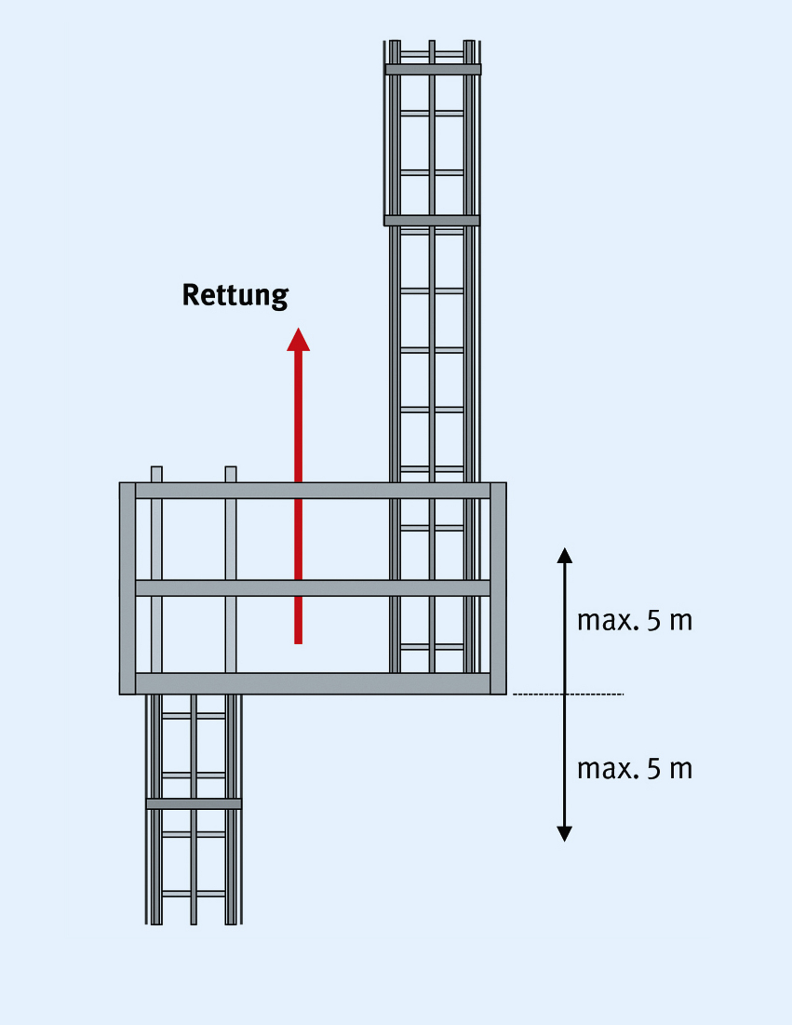 Durch einen Rückenschutz wird ein senkrechter Absturz innerhalb des Steigleiterlaufs allerdings nicht verhindert. Um das Verletzungsrisiko zu minimieren, ist daher zu empfehlen, die Aufstiegshöhe und damit die mögliche Fallhöhe durch den Einbau von Zwischenpodesten auf maximal 5 m zu beschränken (siehe Abb. 8). Alternativ hierzu kann unabhängig von der Fallhöhe eine Steigschutzeinrichtung installiert werden. Voraussetzung hierbei ist allerdings, insbesondere im Hinblick auf einen möglichen Fluchtfall, dass die erforderliche PSAgA permanent getragen wird.