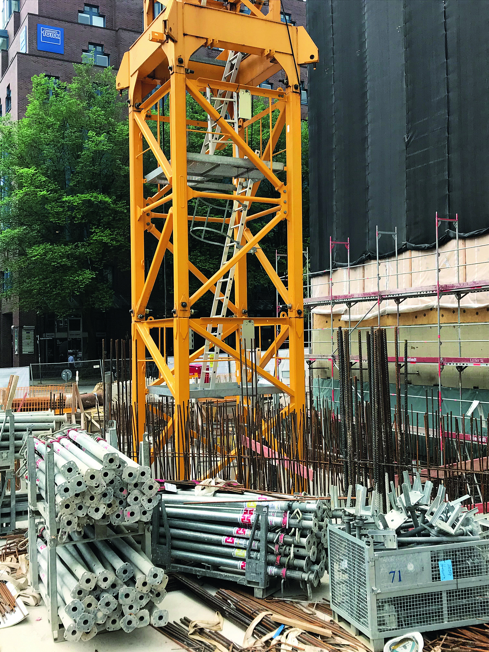 Aufgrund der Regelungen des § 8 (7) der UVV „Bauarbeiten“ ist vorgegeben, dass die Zugänge zu hoch- und tiefgelegenen Arbeitsplätzen als Treppen ausgeführt werden müssen. Als Zugang kommen hierbei vorrangig aus Gerüstbauteilen errichtete Treppentürme infrage, da mit ihnen auf relativ kleinem Raum große Höhen überbrückt werden können. Für die lichte Breite der Stufen von Gerüsttreppen ist in der EN 12811-1 ein Mindestwert von 0,50 m festgelegt.[1] Breitere Treppenaufgänge sind problemlos darzustellen. Treppentürme erfüllen somit die Forderung der Arbeitsstättenregel ASR A1.8, die für Verkehrswege auf Baustellen ebenfalls eine Mindestbreite von 0,50 m angibt (siehe Abb. 1 und 2).[2]