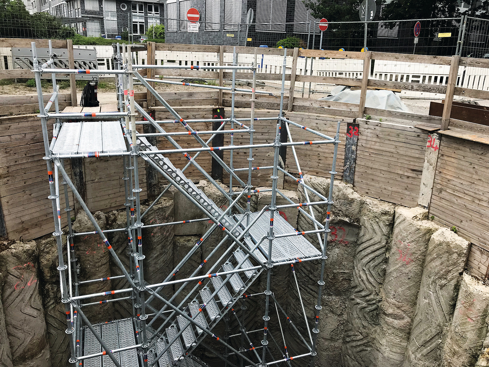 Arbeitsplätze in Baugruben und Schächten müssen über möglichst sichere Verkehrswege erreichbar sein. Als Zugang sind daher vorrangig Treppen bzw. Treppentürme sowie Baustellenaufzüge vorzusehen. Leiteraufstiege dürfen nur in Ausnahmefällen zum Einsatz kommen.
