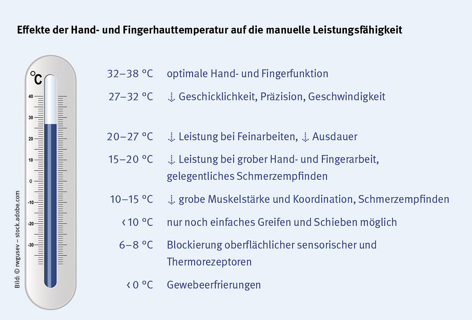 „Kontaktkälte“ stellt bei manuellen Tätigkeiten zudem eine besondere Gefährdung dar: So kann schon eine ungeschützte Berührung von tiefkalten Metallen (≤ – 10 °C) bereits nach wenigen Sekunden zu lokalen Erfrierungen führen.
