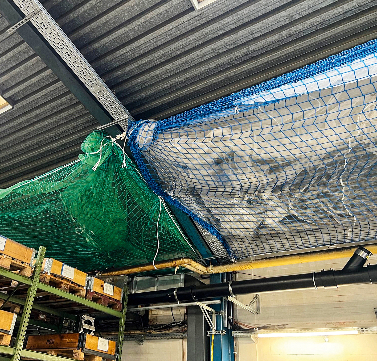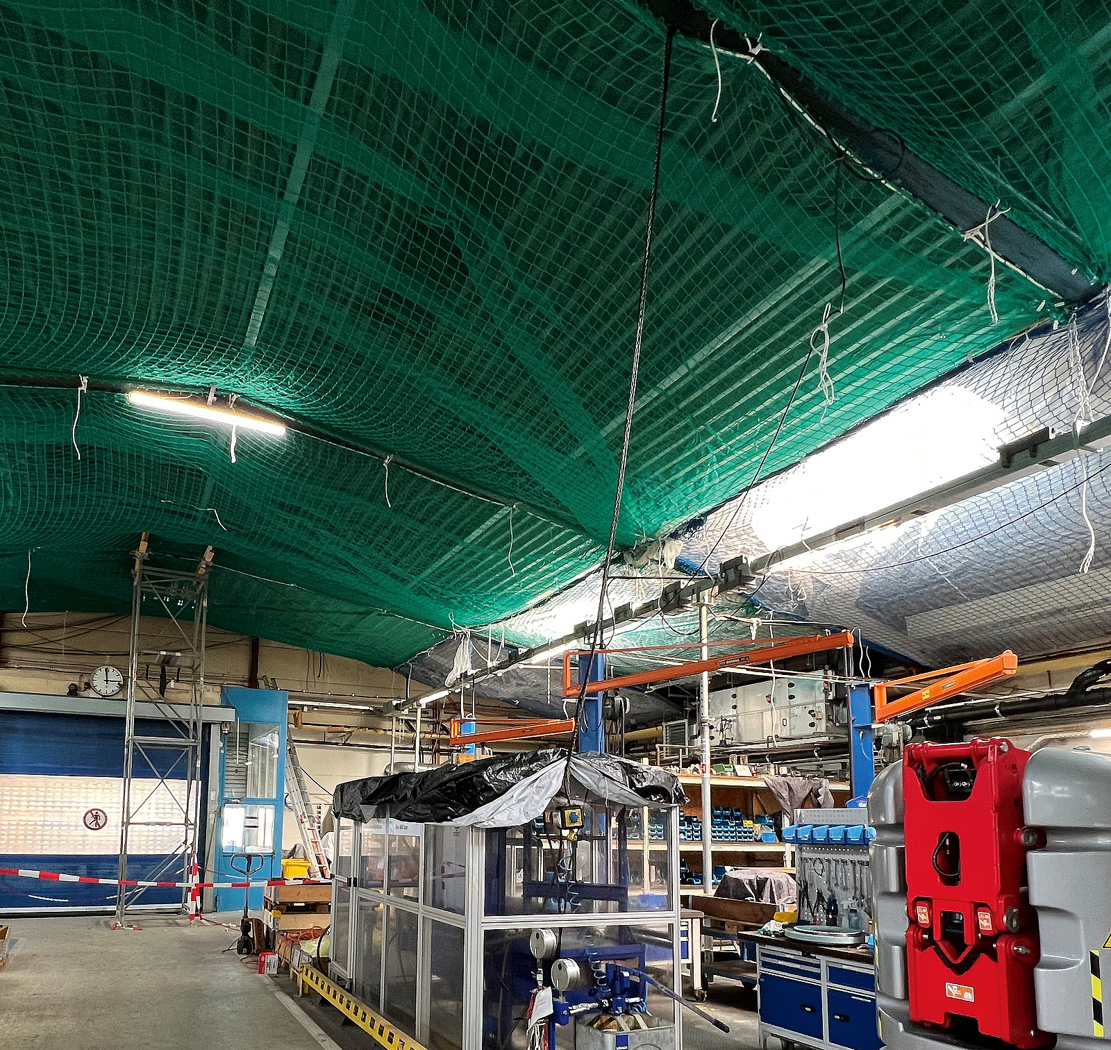 Die Netze waren notwendig, um zum einen die Beschäftigten des Dachdeckerunternehmens bei den Arbeiten vor Ab- und Durchsturz zu schützen und zum anderen die Beschäftigten in den Produktionshallen 3 und 9 vor herunterfallenden Elementen zu sichern – denn die Sanierung wurde und wird bei laufendem Betrieb durchgeführt. Dementsprechend war es nicht möglich, andere technische Maßnahmen wie Gerüste oder eine Hubarbeitsbühne zum Schutz der Beschäftigten aufzustellen, weil es keinen Platz dafür gab.