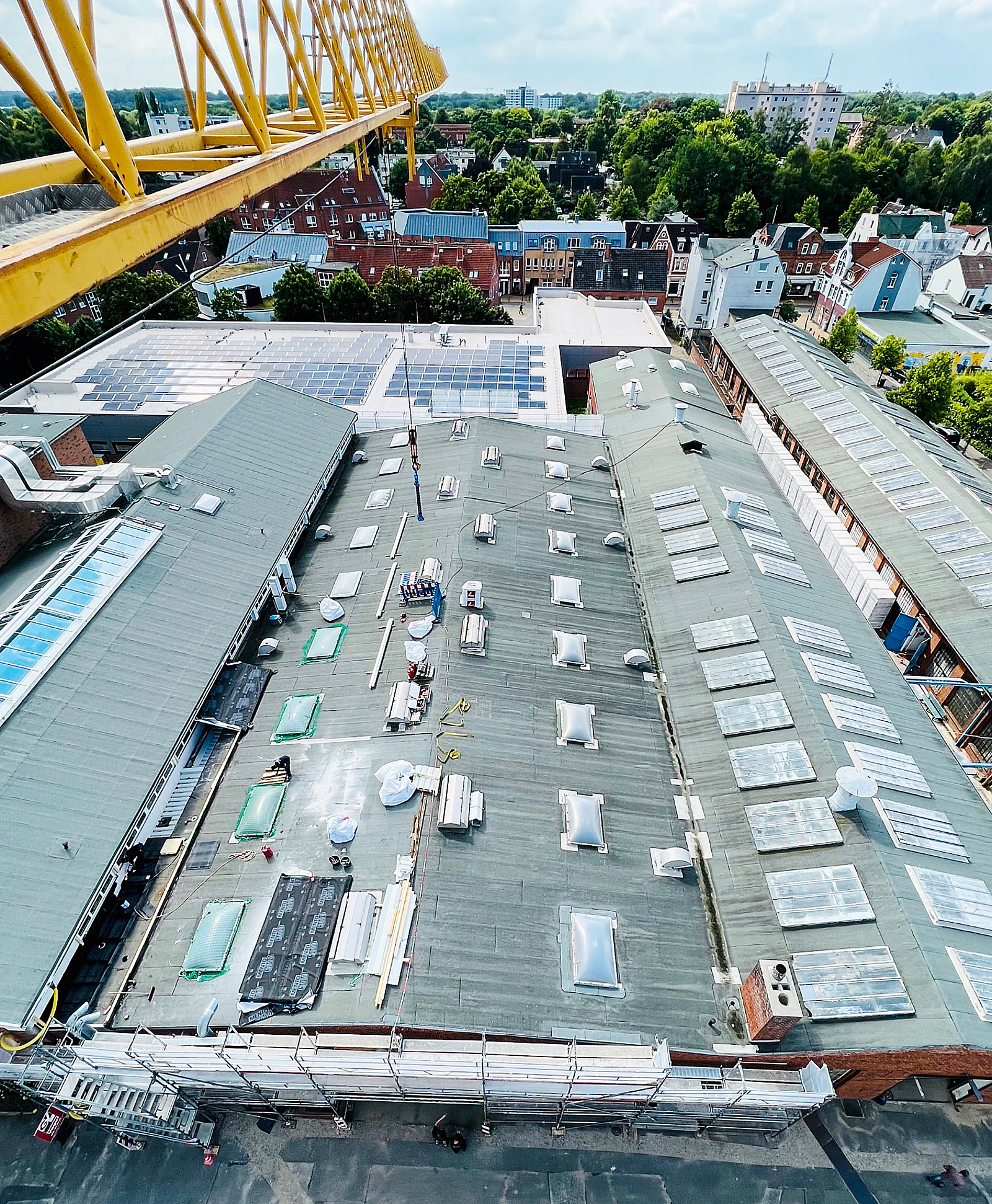 Witterung und Schwerkraft haben den Dachelementen in den letzten Jahrzehnten schwer zugesetzt, sodass eine umfassende Abdichtung nicht ausreichte, sondern ein Abbruch des bestehenden Dachs notwendig wurde. Mit der Sanierung der beiden Dächer samt Abbruch des Bestandsdachs wurde das Dachdeckerunternehmen Sönke Nissen GmbH & Co. KG aus Fleckeby beauftragt. Die Dächer der Produktionshallen 3 und 9 werden einen neuen Warmdachaufbau, bestehend aus einer Tragschale mit Dachtrapezblechen Profil 85/280 bzw. 135/310, einer Dampfsperre, EPS-Wärmedämmstoff (140 mm) sowie einer zweilagigen bituminöse Dachabdichtung, erhalten.